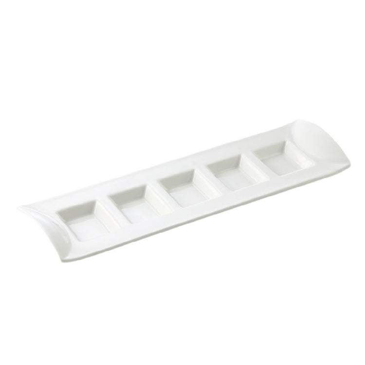 The CAC China CN-5T13 CN Compartment Tray is a precision-engineered rectangular tray designed for various culinary settings. Measuring 13 inches in length, 3-7/8 inches in width, and 1-3/8 inches in height, this tray features five compartments, each with a capacity of 1/2 oz., making it an ideal solution for portion control and presentation. Crafted from high-quality porcelain, this tray is a versatile addition to any kitchen environment, whether it be a bustling restaurant or a catering service. Its Super White finish adds a touch of elegance to food displays, enhancing visual appeal while maintaining simplicity. The CN-5T13 tray is dishwasher safe, ensuring ease of maintenance, and is also oven and microwave safe, offering flexibility for various culinary applications. Sold by the case with two dozen trays per case, it provides a practical option for large-scale food service operations seeking to balance function with style. This tray's robust construction and thoughtful design make it an indispensable tool for chefs and food service professionals who demand both quality and efficiency in their kitchenware.