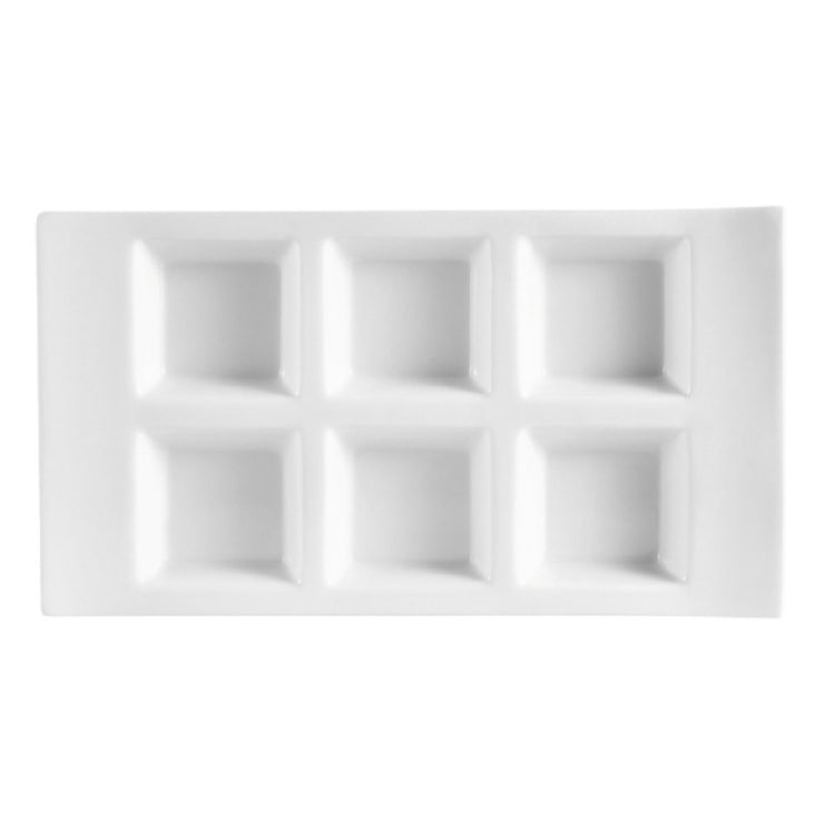 The CAC China CN-6T10 CN Divided Side Dish Plate is a versatile and practical addition to any dining setting. This rectangular plate measures 10-3/4 inches in length, 6 inches in width, and 1-1/8 inches in height, making it suitable for various culinary presentations. It features six compartments, each with a capacity of 1 oz., allowing for an organized and appealing display of multiple food items simultaneously. Made from high-quality porcelain, the plate is designed in a Super White finish, enhancing the presentation of any dish. It is dishwasher, oven, and microwave safe, providing convenience and flexibility in both preparation and cleanup. This product is sold by the case, with each case containing one dozen plates, catering to the needs of professional kitchens and large-scale dining establishments. The CAC China CN-6T10 is ideal for restaurants, catering services, and hospitality venues looking to offer a sophisticated and functional serving solution. Its durable construction and elegant design make it a valuable choice for both casual and formal dining experiences, ensuring that it meets the diverse needs of the food service industry.