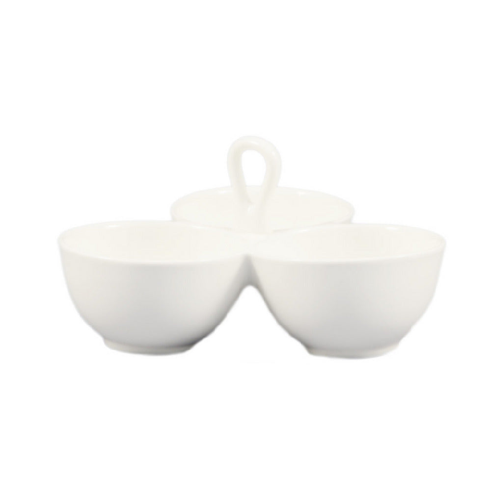 The CAC China COL-40 Accessories Divided Bowl is a versatile and practical solution designed to meet the needs of various market segments within the food service industry. This divided bowl features a leaf-shaped design, with three distinct compartments, each capable of holding 8 oz., making it ideal for portion control and serving a variety of foods simultaneously. With dimensions of 8"L x 8"W x 4-1/4"H, it is compact yet spacious enough to accommodate diverse culinary presentations. The bowl includes a convenient handle, enhancing ease of use and transport. Crafted from porcelain, it boasts a Super White finish, adding an elegant touch to any table setting. The COL-40 Accessories Divided Bowl is microwave, oven, and dishwasher safe, offering flexibility in food preparation and effortless cleaning. Sold by the case, with a dozen bowls per pack, this product is an excellent choice for restaurants, catering services, and hospitality venues aiming to combine functionality with style in their dining experience. Its durable construction and unique design make it a valuable addition to any professional kitchen, providing both aesthetic appeal and practicality.