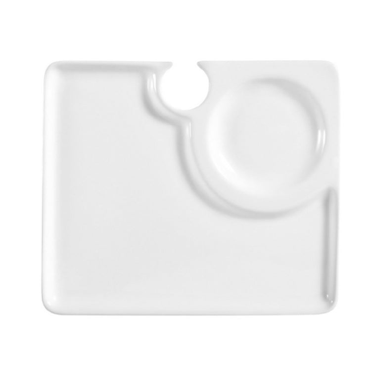 The CAC China COL-P2 Party Collection Platter is a versatile dishware piece designed to enhance dining experiences across various settings. Measuring 9 inches in length, 7-3/4 inches in width, and 3/4 inches in height, this rectangular platter is crafted from durable porcelain, ensuring both aesthetic appeal and functional resilience. Its Super White finish adds a touch of elegance, making it suitable for upscale gatherings or casual parties. The platter features an innovative design that includes a wine glass hole, allowing for convenient glass placement, and a dedicated sauce compartment to keep dips or condiments neatly organized. This thoughtful design caters to the needs of caterers, event planners, and home entertainers alike, providing a practical solution for seamless serving. Its compatibility with dishwashers, ovens, and microwaves underscores its practicality, offering flexibility and ease of use in various culinary environments. Sold by case, with each case containing 2 dozen platters, the CAC China COL-P2 Party Collection Platter is an excellent choice for bulk purchases, catering to the needs of large-scale events or restaurant settings. This product presents a unique blend of utility and style, making it a valuable addition to any dining collection.