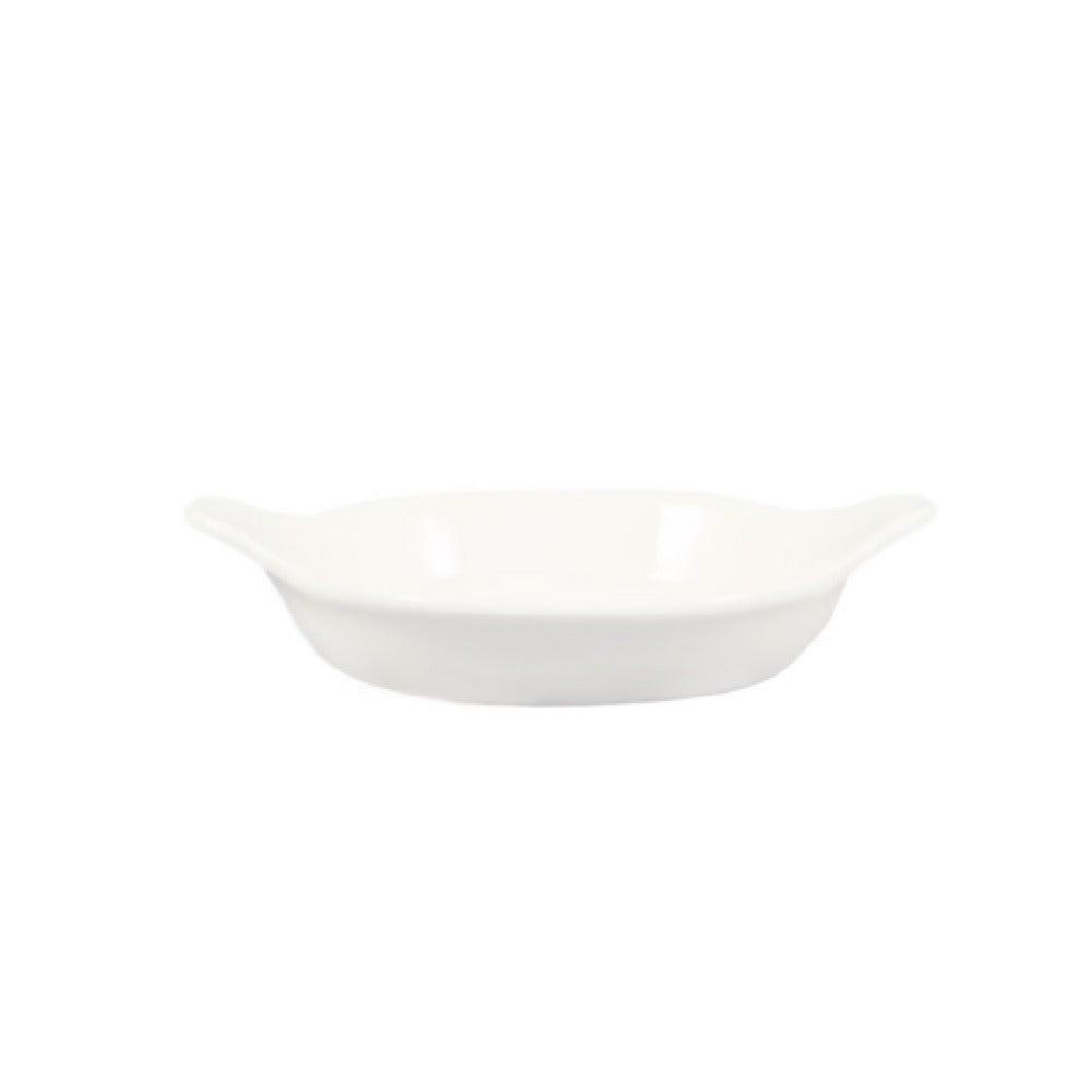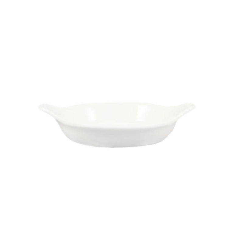 The CAC China EGD-8 Egg Dish 8 Oz. 7-7/8"L x 6-1/2"W x 1-1/4"H is a meticulously designed oval stoneware dish with a volume capacity of 8 ounces, ideal for both residential and commercial kitchens. Featuring dual handles, this dish is crafted from durable ceramic in a striking Bone White finish, ensuring a timeless aesthetic while offering practical functionality. The dimensions of 7-7/8 inches in length, 6-1/2 inches in width, and 1-1/4 inches in height make it a versatile choice for serving individual portions or side dishes, enhancing presentation with its elegant design. Its construction supports a wide range of culinary applications as it is safe for use in the dishwasher, oven, and microwave, underscoring its adaptability and convenience in fast-paced kitchen environments. Sold by the case with a packing configuration of 3 dozen per case, this egg dish is particularly suited for restaurants, catering services, and hospitality businesses seeking bulk purchase options for efficient table service. The CAC China EGD-8 Egg Dish combines quality craftsmanship with practical features, making it a valuable addition to any dining setting seeking both utility and style.