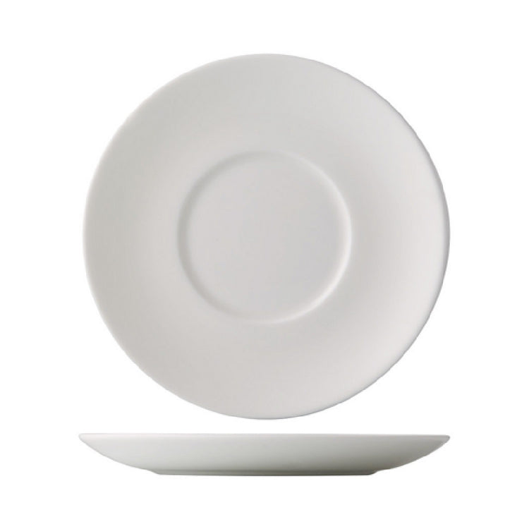 The CAC China EVT-36 Everest Saucer is a meticulously designed piece with dimensions of 4-5/8 inches in diameter and 3/8 inches in height, tailored to meet the demanding needs of the food service industry. Crafted from high-quality porcelain, this saucer features a glazed foot for enhanced stability and a bone white finish that complements any table setting. Its fully vitrified construction ensures superior durability and resistance to chipping, making it an ideal choice for busy restaurants and cafes. The saucer is dishwasher, oven, and microwave safe, offering convenience and versatility for both high-volume dining establishments and intimate cafes. Sold by the case, with each case containing 36 units, it is designed to cater to various market segments, from large-scale catering services to boutique coffee shops. The CAC China EVT-36 Everest Saucer seamlessly combines functionality with elegance, providing a reliable and stylish serving option that works harmoniously with its matching piece, the EVT-35. Its robust design and practical features make it an invaluable addition to any professional kitchen or dining environment.