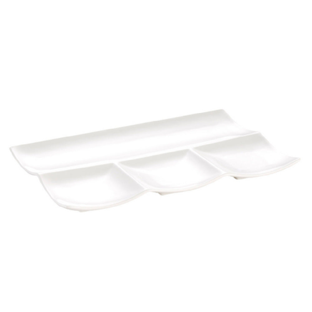 The CAC China F-12S Accessories Platter is a versatile and durable serving solution, measuring 12 inches in length, 8 inches in width, and 1 inch in height, making it ideal for various culinary settings. This rectangular platter is crafted from high-quality porcelain in a classic Bone White finish, which adds a touch of elegance to any table setting. Featuring four compartments, it is designed to keep different food items separated, enhancing the presentation and organization of multiple dishes. Its construction ensures it is safe for use in the dishwasher, oven, and microwave, providing convenience and flexibility for busy kitchens. Sold by the case and packed by one dozen, the CAC China F-12S platter is a practical choice for restaurants, caterers, and home entertainers who require reliable and stylish serving ware. The platter's robust design and multi-functional capabilities make it a valuable addition to any food service operation, providing both aesthetic appeal and functional utility.