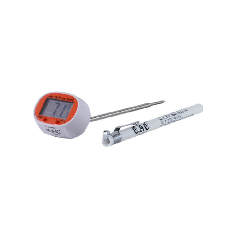 The CAC China FPMT-DG21 Equil Thermo® Digital Instant Read Thermometer is engineered to deliver precise temperature readings with its advanced digital technology. This thermometer features a 1-1/4" LCD display for easy readability, which is complemented by an impressive 180-degree head swivel, enhancing its usability in various settings. Designed for versatility, it is equipped with a protective sleeve and clip, ensuring durability and convenience during use and storage. The thermometer boasts an extensive temperature range of -49-392°F (-45-200°C), making it an indispensable tool for chefs, laboratory technicians, and food safety inspectors who demand accuracy and reliability across a wide spectrum of applications. The product is NSF certified, indicating its compliance with rigorous safety and sanitation standards, essential for professional culinary environments. Packed 72 units per case, this thermometer is suited for bulk purchasing, supporting the needs of large-scale operations. The CAC China FPMT-DG21 serves not only the culinary industry but also sectors requiring precise temperature monitoring, standing out for its durability, user-friendly design, and broad operational range.