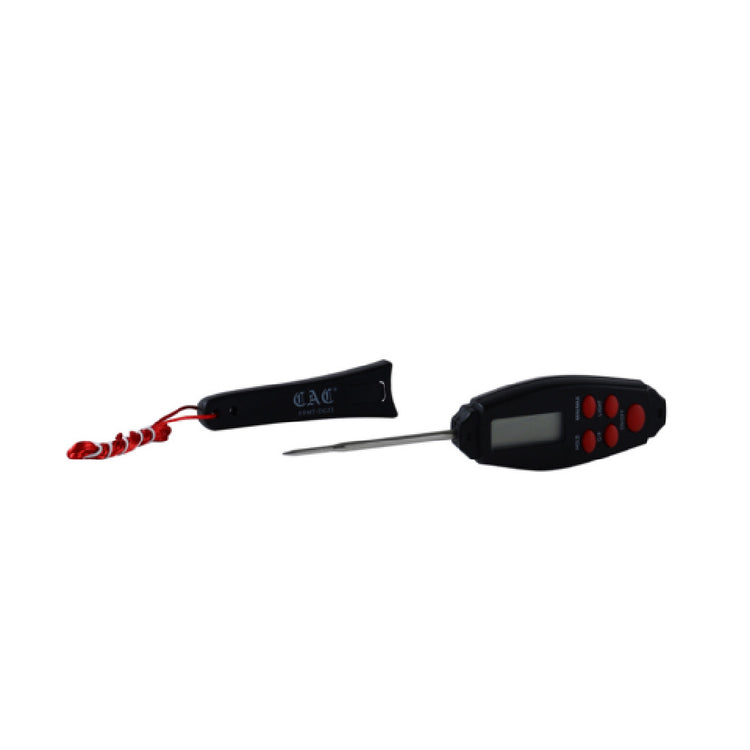 The CAC China FPMT-DG23 Equil Thermo® Digital Instant Read Thermometer is a precision tool essential for culinary professionals and food safety experts who require accurate temperature readings. Featuring a 1-3/8" LCD display, it ensures clear visibility, even in low-light conditions, thanks to its backlight feature. The thermometer's wide temperature range spans from -49°F to 392°F (-45°C to 200°C), providing versatility for various cooking and food safety applications. Equipped with a min/max memory function, it allows users to easily track temperature changes over time, which is crucial for maintaining consistent cooking standards. The hold function further enhances its utility by enabling users to lock the current temperature reading on the display. This digital thermometer is NSF certified, signifying its adherence to rigorous public health and safety standards. Packed in cases of 72, it is suited for large-scale use in commercial settings such as restaurants, catering services, and food manufacturing. The CAC China FPMT-DG23 Equil Thermo® Digital Instant Read Thermometer combines reliability, accuracy, and user-friendly features, making it an indispensable tool for professionals who demand precision and compliance in their operations.