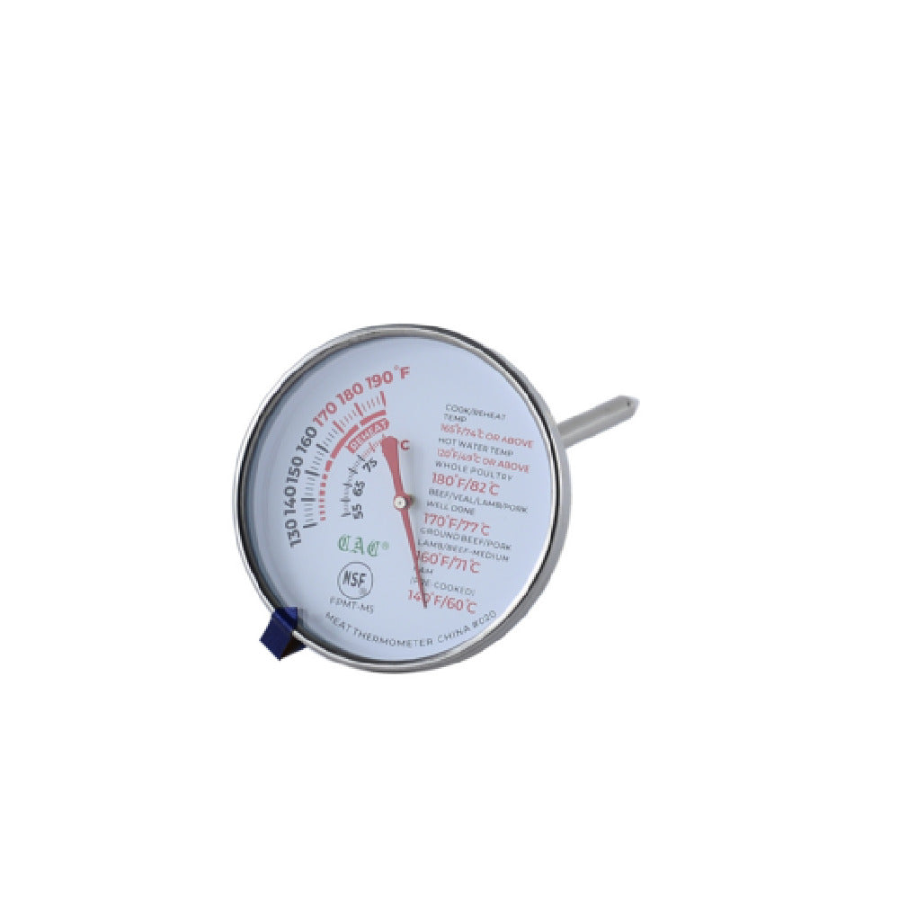 The CAC China FPMT-M5 Equil Thermo® Meat Thermometer is a precision instrument engineered for culinary professionals and home chefs alike, offering a 3-inch dial paired with a 5-inch probe length for accurate temperature readings. Designed with an adjustable indicator, it allows for customized temperature tracking within a range of 130-190°F (55-85°C), accommodating various cooking requirements and ensuring meat is cooked to perfection. This meat thermometer is NSF certified, which guarantees its adherence to the highest standards of safety and hygiene, making it a reliable tool for the food service industry. The CAC China FPMT-M5 is packaged with 72 units per case, making it a practical choice for commercial kitchens, catering businesses, and culinary schools. Its robust construction and precise measurement capabilities make it an essential tool for achieving consistent cooking results, enhancing the quality and safety of culinary creations. Whether used in a bustling restaurant or a home kitchen, this meat thermometer stands out for its reliability and precision, ensuring that every dish meets exacting standards of excellence.