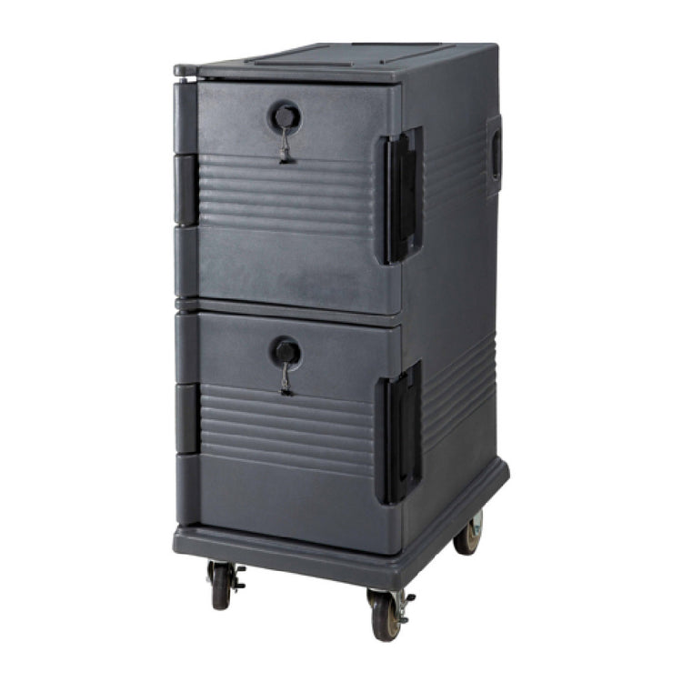CAC China ICTP-2 Food Pan Carrier Full Size (2) Compartments is a highly functional solution designed for the effective transportation and storage of food pans. This carrier is engineered to hold full-size 1/1, half-size 1/2, and third-size 1/3 food pans, providing versatility for various food service settings. The unit is insulated with polyurethane foam, ensuring that the temperature is maintained for longer periods, which is critical for preserving food quality during transit. An adjustable vent cap allows for optimal control of internal conditions, catering to different requirements of the food being stored. Featuring a design that is both stackable and interlocking, the CAC China ICTP-2 maximizes space efficiency and stability during storage and transport. Made from durable polyethylene, the carrier is robust and reliable, serving as a long-lasting asset in any food service operation. The gray color of the unit adds a professional and clean appearance. Recognized with NSF certification, this product adheres to high standards of public health and safety, making it suitable for use in various commercial kitchens. It is important to note that this item is shipped by freight only and is packed as one set, highlighting the substantial nature of the product.