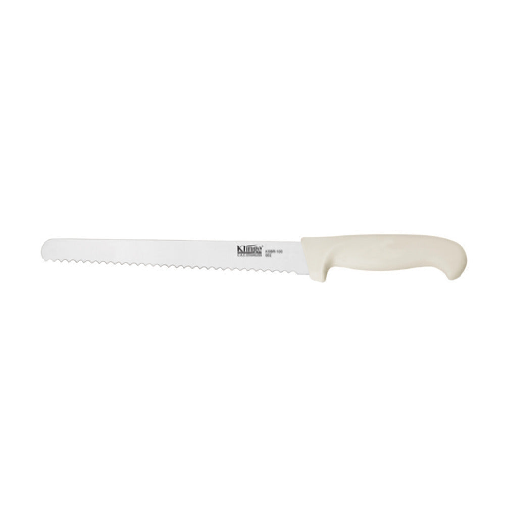 The CAC China KSBR-100 Klinge® Bread Knife 10" Stamped is a precision-engineered kitchen tool designed for professional and home bakers alike. This bread knife features a 10-inch blade crafted from German high-carbon steel, known for its exceptional sharpness and durability, ensuring clean and effortless slicing through various types of bread. The blade is stamped, which offers a lightweight feel and ease of handling for precision cutting tasks. Complementing the high-quality blade is the non-slip white handle, designed with a protective grip to provide optimal comfort and safety during use, reducing the risk of hand fatigue or accidents in busy kitchen environments. Ideal for bakeries, cafes, and home kitchens, this bread knife is packaged in cases of 36, meeting the demands of commercial settings while also appealing to individual culinary enthusiasts seeking a reliable and efficient bread-cutting solution. The CAC China KSBR-100 Klinge® Bread Knife represents a blend of high-performance materials and thoughtful design, making it a valuable addition to any culinary toolkit where precision and reliability are paramount.