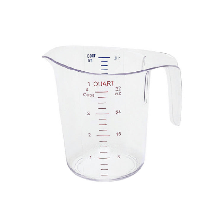The CAC China MCBK-100 Measuring Cup 1 Qt./100-1000 ML Molded-in Thumb-grip Handle is a versatile and practical tool for both domestic and commercial kitchens. This measuring cup features dual color embossed graduations, allowing users to measure ingredients accurately in both metric and imperial units, ranging from 100 to 1000 milliliters or up to 1 quart. Its unique molded-in thumb-grip handle provides a secure and ergonomic grip, enhancing ease of use and stability while pouring or measuring liquid ingredients. Crafted from durable polycarbonate, this measuring cup is both chipping and temperature resistant, ensuring longevity and resilience under various kitchen conditions. Additionally, it is dishwasher safe, simplifying the cleaning process and maintaining hygiene standards effortlessly. Certified by the NSF, this product meets rigorous public health and safety standards, making it suitable for professional culinary environments. Packed in cases of 36, it is an excellent choice for large-scale food service operations, offering reliability and accuracy in food preparation tasks across different market segments within the culinary industry.