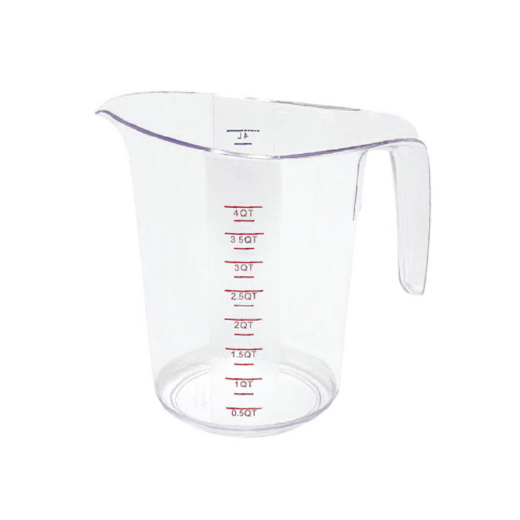 The CAC China MCBK-400 Measuring Cup is a 4-quart or 400-4000 milliliter capacity tool designed for precision in culinary settings. Featuring a molded-in thumb-grip handle, this measuring cup provides ease of use and enhanced control during pouring. It boasts dual color embossed graduations in both metric and imperial measurements, ensuring accuracy and versatility for professionals and home cooks alike. Constructed from durable polycarbonate, the MCBK-400 is both chipping and temperature resistant, making it suitable for a range of kitchen environments. Its dishwasher-safe design simplifies the cleaning process, maintaining hygiene without compromising the material integrity. Additionally, the product is NSF certified, highlighting its compliance with strict public health and safety standards. Packed by 24 each per case, the CAC China MCBK-400 Measuring Cup is an ideal choice for commercial kitchens, cafeterias, and educational institutions, where large-volume cooking and precise measurement are essential. Its robust construction and thoughtful design elements set it apart as a reliable measuring tool in any culinary setting.