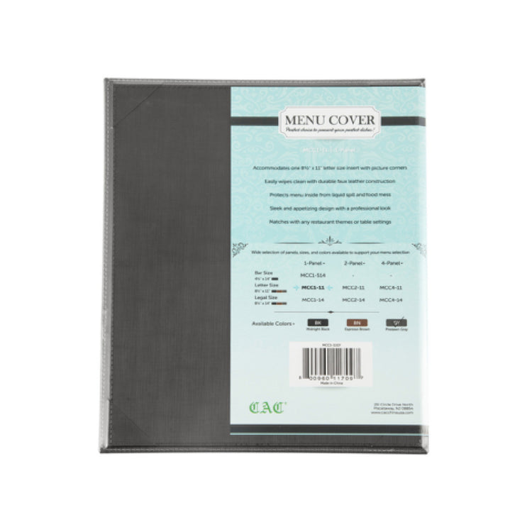 The CAC China MCC1-11GY Menu Cover is a meticulously designed item tailored for businesses seeking a functional yet stylish solution for displaying menus. This one-panel menu cover measures 8-1/2" x 11", making it a perfect fit for standard letter size documents. The cover is crafted from faux leather, providing a sophisticated and durable alternative to genuine leather, with a sleek gray finish that adds a touch of modern elegance to any dining setting. Packed by 50 each per case, this product is ideal for restaurants, cafes, and event venues that require a consistent and cohesive presentation for their menu offerings. Its simple yet effective design ensures that menus remain protected and presentable, enhancing the overall dining experience for patrons. The CAC China MCC1-11GY Menu Cover combines practicality with aesthetic appeal, offering a versatile solution that meets the demands of various market segments within the food service industry. Whether used in upscale dining establishments or casual eateries, this menu cover exemplifies quality and style, making it a valuable addition to any business that prioritizes customer engagement and satisfaction.