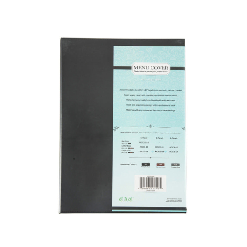 The CAC China MCC2-14BK Menu Cover is a versatile and practical solution for food service establishments seeking to present their menu offerings with style and durability. Measuring 8-1/2 inches by 14 inches, this menu cover accommodates legal-sized documents, making it suitable for a wide range of menu types, from casual dining to more formal settings. Constructed with a faux leather material, it offers an elegant black finish that adds a touch of sophistication to any dining environment. The 2-panel design provides ample space for displaying menu items while maintaining a sleek profile. Each case contains 30 of these menu covers, ensuring that establishments have enough to meet their needs. The choice of faux leather not only enhances the aesthetic appeal but also ensures easy cleaning and maintenance, making it ideal for high-traffic areas. The CAC China MCC2-14BK Menu Cover is particularly advantageous for restaurants, cafes, and hotels that prioritize both function and style in their menu presentation. Its design and construction make it a reliable choice for those looking to enhance the dining experience by providing guests with a clear and attractive view of their menu options.