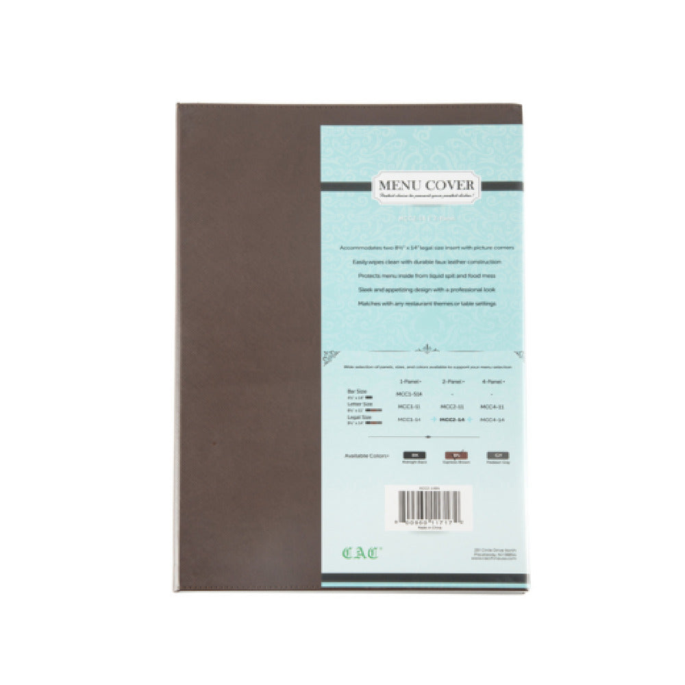 The CAC China MCC2-14BN Menu Cover is a versatile and stylish option designed for restaurants and hospitality venues seeking a professional appearance. This product features a 2-panel design, allowing for convenient display of menu contents in an organized manner. Measuring 8-1/2 inches by 14 inches, it is tailored to accommodate legal-size documents, providing ample space for your menu items. Crafted from high-quality faux leather in a rich brown shade, this menu cover combines durability with a sophisticated look, ensuring it withstands the rigors of daily use while complementing various interior decors. Packed by 30 each per case, the CAC China MCC2-14BN is also a practical choice for large establishments needing multiple covers. The robust construction and premium materials make this menu cover an excellent investment for businesses aiming to enhance their dining presentation. Its elegant appearance and functional design make it suitable for diverse market segments, from upscale dining establishments to casual eateries, ensuring that menus are presented in a polished and professional manner. With the CAC China MCC2-14BN, establishments can elevate their customer experience by providing a visually appealing and functional menu display solution.