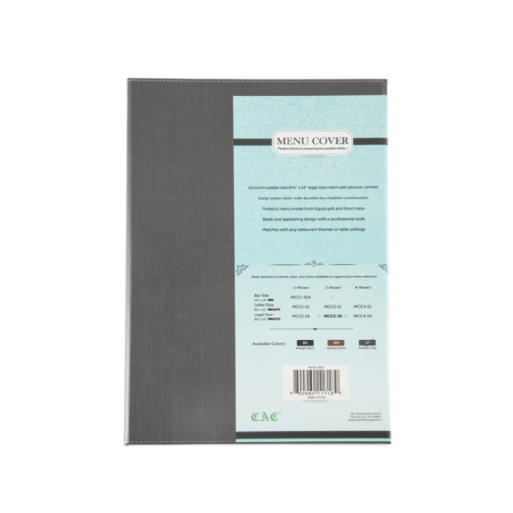The CAC China MCC2-14GY Meun Cover 2-panel 8-1/2" X 14" is a versatile and stylish solution for presenting menus in various dining establishments. Crafted from high-quality faux leather, this menu cover exhibits a refined gray finish that lends a sophisticated look to any table setting. Measuring 8-1/2" x 14", it accommodates legal-size documents, making it an ideal choice for restaurants, cafes, and hotels that require ample space for detailed menu offerings. The two-panel design provides a practical way to display menus, ensuring easy accessibility and readability for guests. Each case contains 30 of these durable menu covers, offering a cost-effective option for businesses seeking to maintain a consistent and professional appearance across multiple dining tables. The CAC China MCC2-14GY Meun Cover combines functionality with elegance, making it a valuable asset in enhancing the dining experience and elevating the establishment's overall presentation. Its robust construction and elegant design make it suitable for various market segments, from upscale restaurants to casual dining venues.