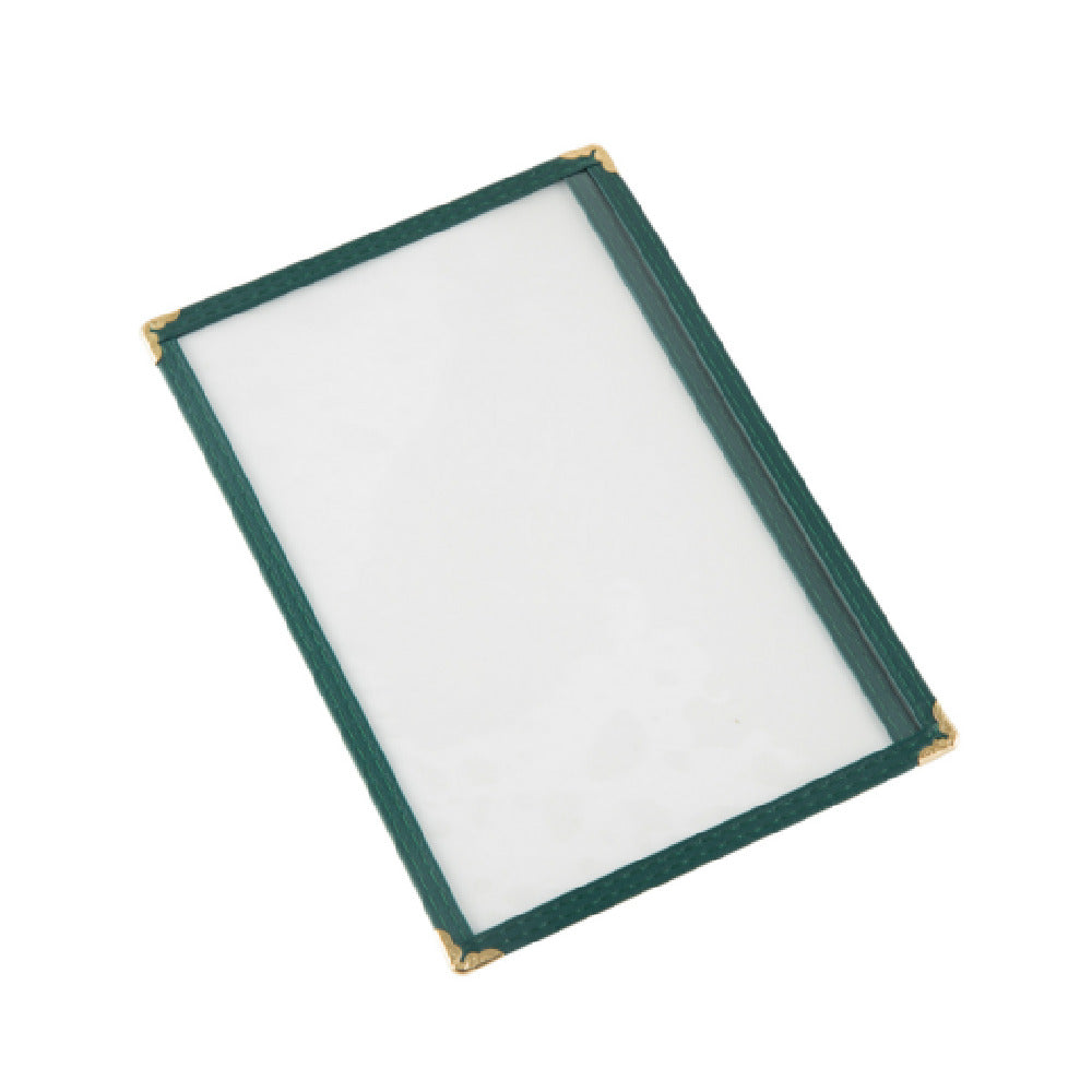 The CAC China MCP1-58GN Menu Cover is a high-quality product designed for practical use in various hospitality settings. This menu cover boasts a 1-pocket design, accommodating an insert size of 8-1/2 inches by 5-1/2 inches. Its clear double-sided view enhances visibility and ensures that the menu content is easily readable from both sides, optimizing space and presentation. The addition of brass corners not only adds a touch of elegance but also ensures durability, protecting the product from wear and tear. Featuring a green trim, it offers a distinctive and stylish aesthetic that complements various interior decors. The CAC China MCP1-58GN is packed with 200 units per case, making it a practical choice for large-scale operations like restaurants, hotels, or event venues that require multiple menu covers. This product provides a reliable solution for businesses seeking a blend of quality, functionality, and visual appeal in their menu presentation tools. Its thoughtful design and sturdy construction make it an essential item for any establishment looking to maintain high standards in customer service and presentation.