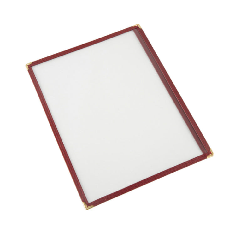 The CAC China MCP1-911BY Menu Cover 1-pocket 8-1/2" X 11" is a versatile and durable menu display solution designed for a variety of dining establishments. This menu cover features a clear double-sided view, allowing for easy visibility of the letter-size inserts, ensuring that menus are presented crisply and professionally. With its brass corners, this menu cover combines functionality with an elegant touch, providing added reinforcement and a sophisticated aesthetic. The burgundy trim adds a classic contrast, making it suitable for upscale restaurants, cafes, and bistros that wish to maintain a refined ambiance. Measuring precisely 8-1/2 inches by 11 inches, this menu cover accommodates standard letter-size inserts, making it an ideal fit for most dining menus. Packed with 200 units per case, this product is particularly advantageous for larger establishments or franchises seeking consistent presentation across multiple locations. Its sturdy construction ensures longevity, even in high-traffic environments, offering a reliable and cost-effective way to enhance the dining experience through visually appealing menu displays.