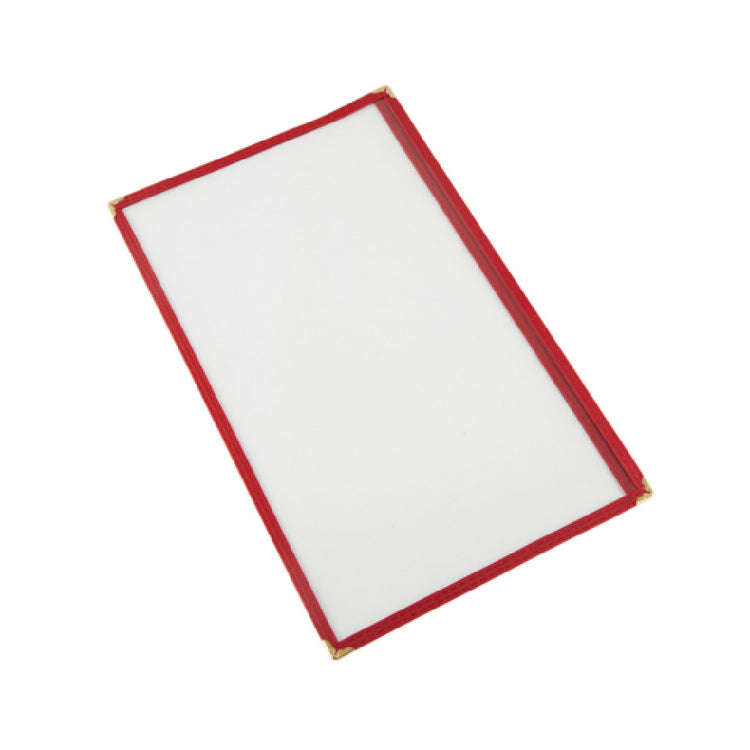 CAC China MCP1-914RD Menu Cover - 1-pocket 8-1/2" x 14" - presents a practical and stylish solution for restaurants, cafes, and hospitality businesses seeking to enhance their menu presentation. This menu cover is designed to hold a legal size insert, ensuring compatibility with a wide range of standard menu formats. The clear double-sided view provides excellent visibility and protection for your menu contents, allowing patrons to easily peruse offerings while keeping them safe from spills and stains. Featuring elegant brass corners, this menu cover combines durability with a touch of sophistication, making it suitable for a variety of dining environments. The red trim adds a vibrant and eye-catching detail that can complement diverse interior decor themes. Supplied in cases of 100, this product is ideal for establishments with high-volume menu display needs or those looking to maintain consistency across multiple locations. With its robust construction and functional design, the CAC China MCP1-914RD Menu Cover provides a reliable and aesthetically pleasing menu presentation solution that meets the demands of the food service industry.