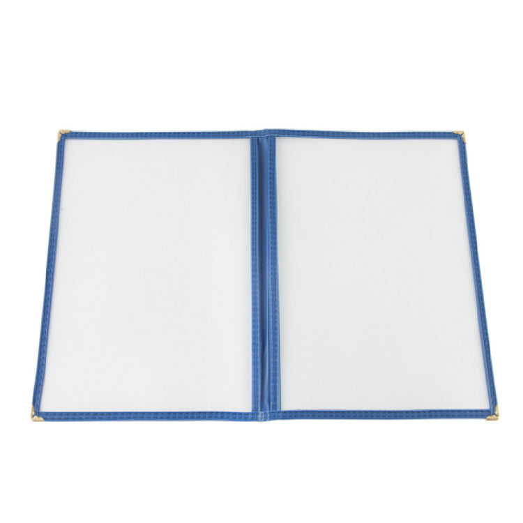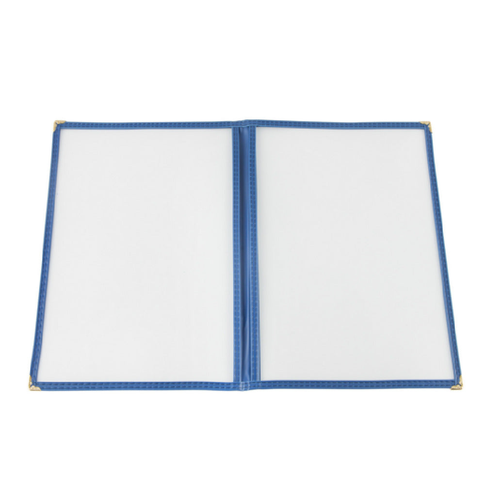 The CAC China MCP2-911BL Menu Cover 2-pocket 8-1/2" x 11" is a versatile and essential accessory for the hospitality industry, designed to enhance the presentation of menus and documents in restaurants, cafes, and hotels. This menu cover accommodates letter-size inserts, providing a clear double-sided view that ensures patrons can easily read menu offerings. The cover is crafted with durable materials, featuring brass corners that add a touch of elegance and protection to the edges, preventing wear and tear from frequent handling. The blue trim not only adds a pop of color but also reinforces the structure, ensuring long-lasting use. Each case includes 100 units, making it ideal for large-scale operations or establishments with multiple menu rotations. The dual pockets offer ample space for displaying multiple pages or promotional materials, catering to various segments within the food service industry that require both functionality and aesthetics. With its practical design and high-quality construction, the CAC China MCP2-911BL Menu Cover seamlessly combines practicality with style, making it an indispensable tool for enhancing customer experience and showcasing menus in a professional manner.