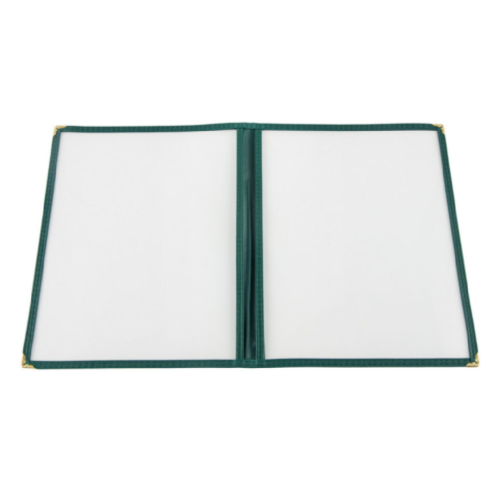 The CAC China MCP2-911GN Menu Cover is a 2-pocket design accommodating 8-1/2" x 11" letter-size inserts, perfect for showcasing menus with clarity and elegance. Each pocket provides a clear, double-sided view, ensuring that your menu or presentation materials are visible and easily accessible from either side. This feature is particularly beneficial for restaurants and hospitality settings where menu visibility enhances customer experience. The menu cover is reinforced with brass corners, adding durability and a touch of sophistication to the overall design. The green trim offers a distinctive aesthetic appeal, making it suitable for various dining environments or businesses seeking to align their branding with specific color schemes. Packed 100 units per case, it caters to high-volume needs, making it an efficient choice for businesses that require bulk purchases. Whether used in upscale dining establishments, casual eateries, or corporate settings, the CAC China MCP2-911GN provides an optimal blend of functionality and style, ensuring that your menus are presented in a manner that reflects professionalism and attention to detail.
