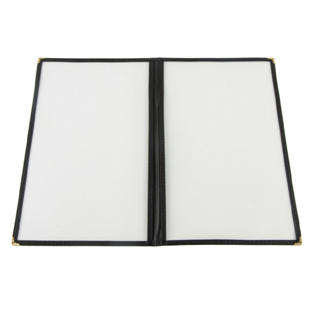 The CAC China MCP2-914BK Menu Cover is a versatile and practical solution for hospitality businesses looking to protect and enhance the presentation of their menus. This menu cover measures 8-1/2" x 14", accommodating legal size inserts with ease. It features a 2-pocket design, allowing for multiple pages to be displayed simultaneously, making it ideal for restaurants, cafes, and hotels that require flexibility in showcasing their menu items. The menu cover is designed with a clear double-sided view, ensuring that both sides of your inserts are visible to customers, thus maximizing the utility of the available space. The black trim adds a sophisticated touch, while the brass corners not only enhance its aesthetic appeal but also provide additional durability and protection to the corners. Packed at 100 each per case, this menu cover is an efficient choice for establishments requiring bulk quantities without compromising on quality. Its robust construction and stylish design make the CAC China MCP2-914BK Menu Cover a preferred choice for various segments within the food service industry, particularly those seeking a blend of practicality and elegance in their menu presentation tools.
