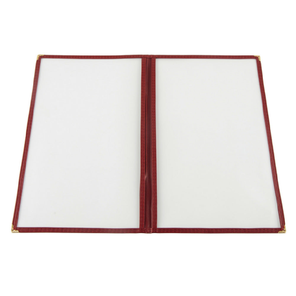 The CAC China MCP2-914BY Menu Cover 2-pocket 8-1/2" x 14" is a sophisticated and functional solution for presenting menus in restaurants, cafes, and hospitality settings. This menu cover is designed to hold legal size inserts, measuring 8-1/2 inches by 14 inches, and features a clear double-sided view to showcase menu items with clarity and style. The cover is accentuated with brass corners, adding a touch of elegance and durability, while the burgundy trim provides a classic and professional appearance. Each case includes 100 menu covers, making it a cost-effective choice for businesses looking to standardize their presentation. The two-pocket design allows for easy organization and access to different sections of the menu, such as beverages and entrees, enhancing the dining experience for patrons. Whether for upscale dining establishments or casual eateries, the CAC China MCP2-914BY Menu Cover offers a practical and aesthetically pleasing way to present menus, ensuring they remain protected while maintaining a high-quality appearance over time. Its robust construction and versatile design make it a valuable asset for any food service operation seeking to enhance their menu presentation.