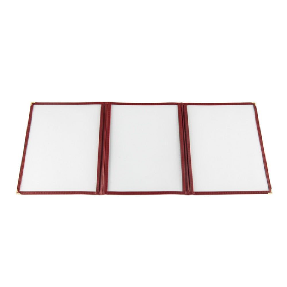 The CAC China MCP3-911BY Menu Cover 3-pocket 8-1/2" X 11" is a versatile and essential accessory for any restaurant, café, or hospitality establishment. Designed to accommodate standard letter-size inserts, this menu cover provides a clear double-sided view, allowing for easy readability and a professional presentation. The inclusion of brass corners not only adds a touch of elegance but also enhances durability, ensuring that the menu cover withstands frequent handling. The burgundy trim offers a classic and sophisticated appearance, making it suitable for a wide range of dining environments. This product is packed by 50 each per case, making it an ideal choice for businesses looking to outfit their entire menu collection or to have spares on hand for future needs. With its practical design and durable materials, the CAC China MCP3-911BY ensures that menus are presented in a manner that is both functional and aesthetically pleasing, making it a valuable asset in the food service industry.