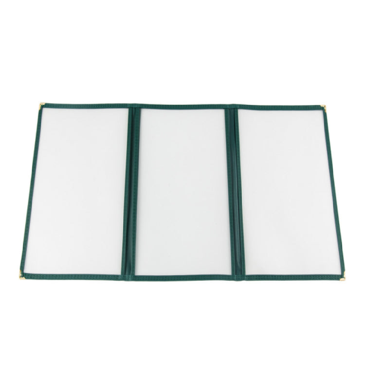 The CAC China MCP3-911GN Menu Cover 3-pocket 8-1/2" x 11" is a meticulously crafted product designed to enhance the presentation of menus in various dining environments. With its three-pocket design, this menu cover provides ample space for displaying multiple menu pages, accommodating 8-1/2" x 11" letter size inserts. The clear double-sided view feature allows for easy visibility of menu options from both sides, ensuring patrons have a seamless dining experience. This menu cover is accentuated with brass corners, adding a touch of elegance and durability, while the green trim offers a classic and professional aesthetic. Each case contains 50 units, making it an ideal choice for restaurants, cafes, and hotels that require bulk orders. The robust construction and practical design of the CAC China MCP3-911GN Menu Cover cater to the needs of the hospitality industry, providing a reliable and stylish solution for menu presentation. This product is well-suited for establishments seeking a balance of functionality and sophistication, ensuring that menus are displayed with clarity and flair.