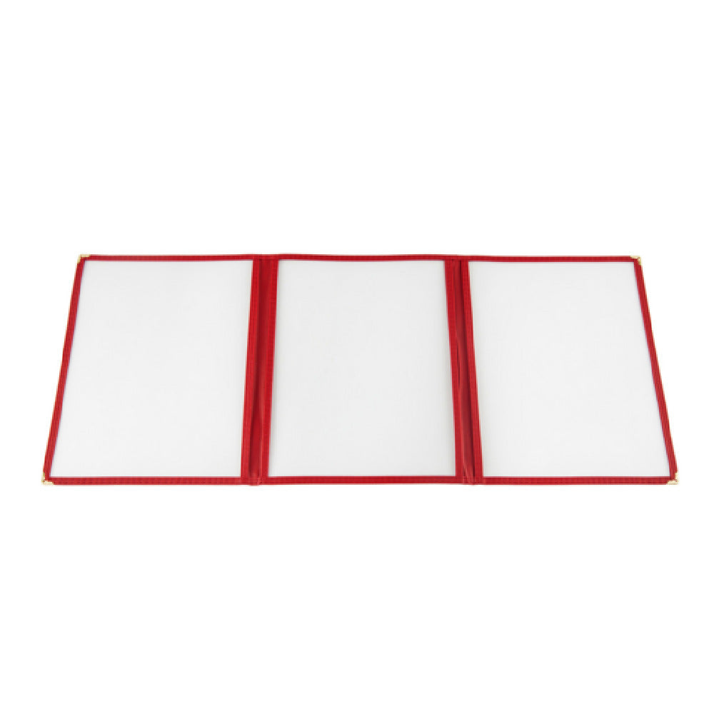 The CAC China MCP3-911RD Menu Cover is a versatile and durable option for presenting menus in a professional setting. This menu cover features a 3-pocket design, accommodating 8-1/2" x 11" letter-size inserts, making it suitable for a variety of restaurant and dining establishments. The clear double-sided view allows for easy visibility of menu items, ensuring that customers can effortlessly peruse the options. The red trim adds a touch of elegance and style, enhancing the overall presentation. Brass corners provide added durability, ensuring longevity and resistance to wear and tear in high-traffic environments. Each case contains 50 menu covers, making it an economical choice for large-scale operations. This product stands out in the industry due to its combination of practicality and aesthetic appeal, catering to the needs of both casual and upscale dining venues. Its straightforward design and robust construction make the CAC China MCP3-911RD Menu Cover an essential tool for enhancing the dining experience and maintaining an organized and polished appearance.