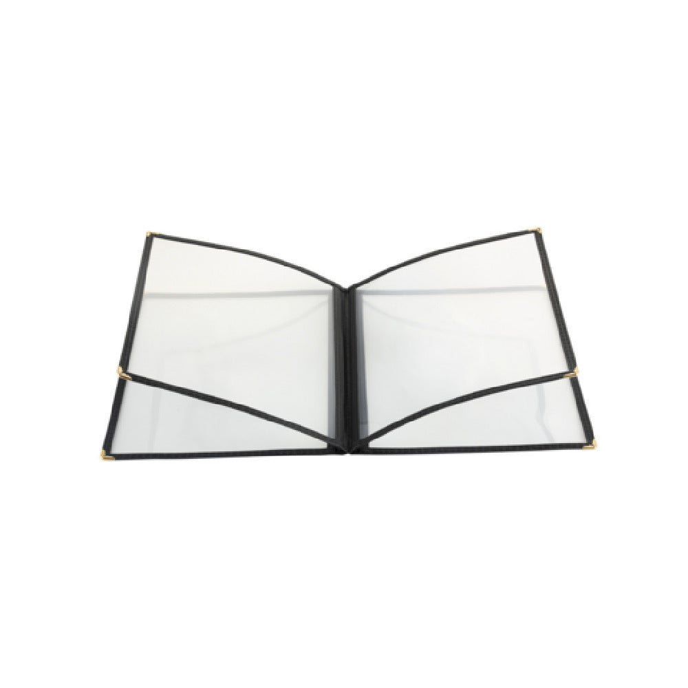 The CAC China MCP4-911BK Menu Cover is a professional-grade menu display solution designed for versatility and durability, catering to various hospitality industry needs. Featuring a four-pocket configuration, it accommodates letter-size inserts measuring 8-1/2" x 11", allowing for organized and accessible menu presentation. Each pocket offers a clear double-sided view, ensuring that menus are visible and legible from both sides, thus enhancing the dining experience. The menu cover is accentuated with brass corners, lending an elegant touch while also providing additional durability to withstand frequent handling. The black trim not only adds a sleek, professional aesthetic but also enhances the overall durability of the menu cover. It is packed in cases of 50, making it an economical choice for businesses of all sizes, from small restaurants to large dining establishments. The CAC China MCP4-911BK Menu Cover's thoughtful design and robust construction make it an essential tool for any venue looking to present their menu in a sophisticated and practical manner.
