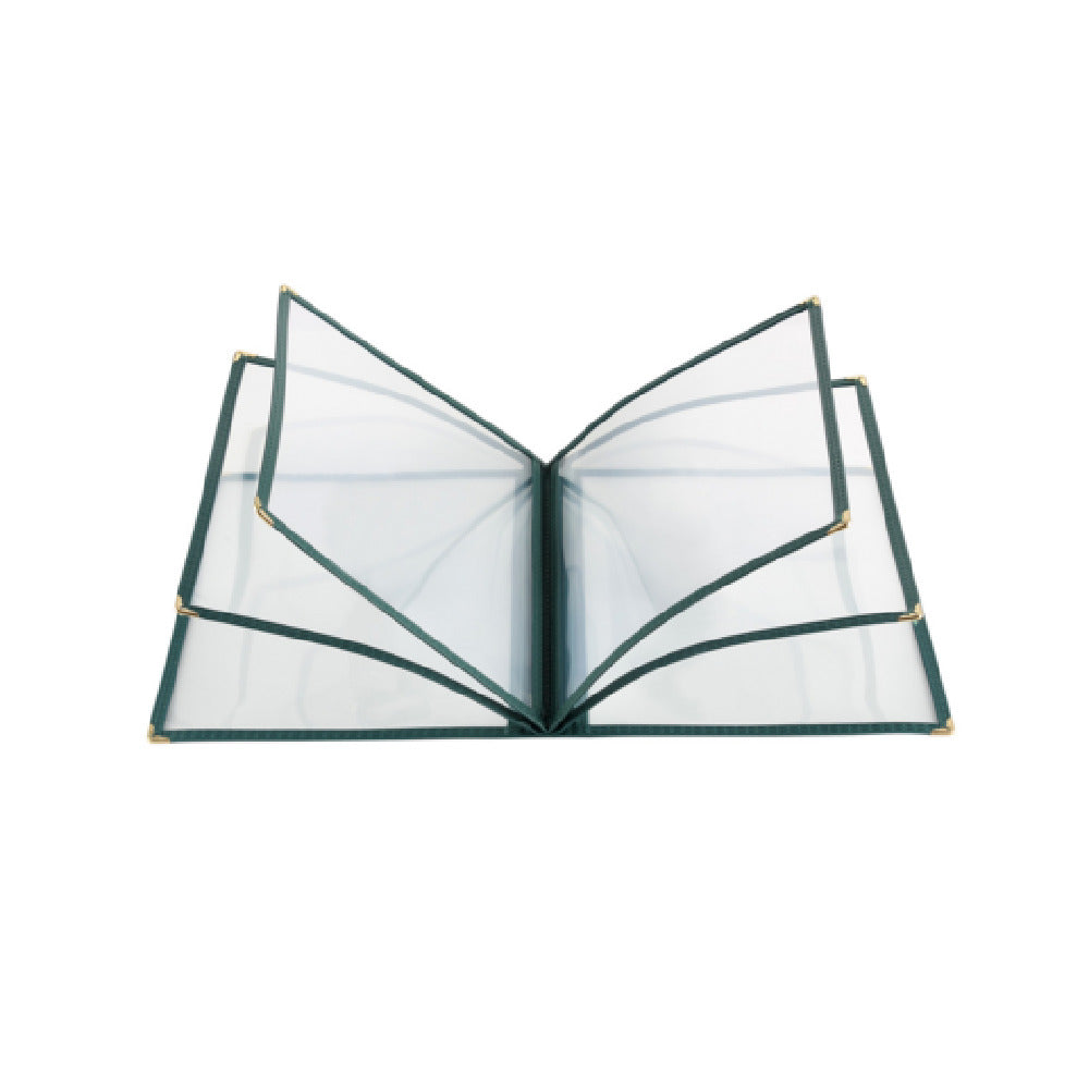 The CAC China MCP6-911GN Menu Cover is a versatile and durable menu solution designed to cater to diverse market segments within the hospitality industry. Measuring 8-1/2" x 11", this menu cover is tailored to fit letter-size inserts, making it a practical choice for various establishments, from upscale restaurants to casual diners. With six pockets, it provides ample space for extensive menu offerings, enhancing the dining experience with an organized and professional presentation. The clear double-sided view feature allows for easy readability of menu items, ensuring that patrons can effortlessly peruse their options. This menu cover is distinguished by its elegant green trim and sturdy brass corners, which add a touch of sophistication while protecting the cover from wear and tear. Packaged 50 per case, it offers an economical solution for large-scale operations or those seeking to standardize their menu presentation across multiple locations. The CAC China MCP6-911GN Menu Cover is not only functional but also aesthetically pleasing, making it an essential asset for any food service business aiming to convey a polished image to its clientele.
