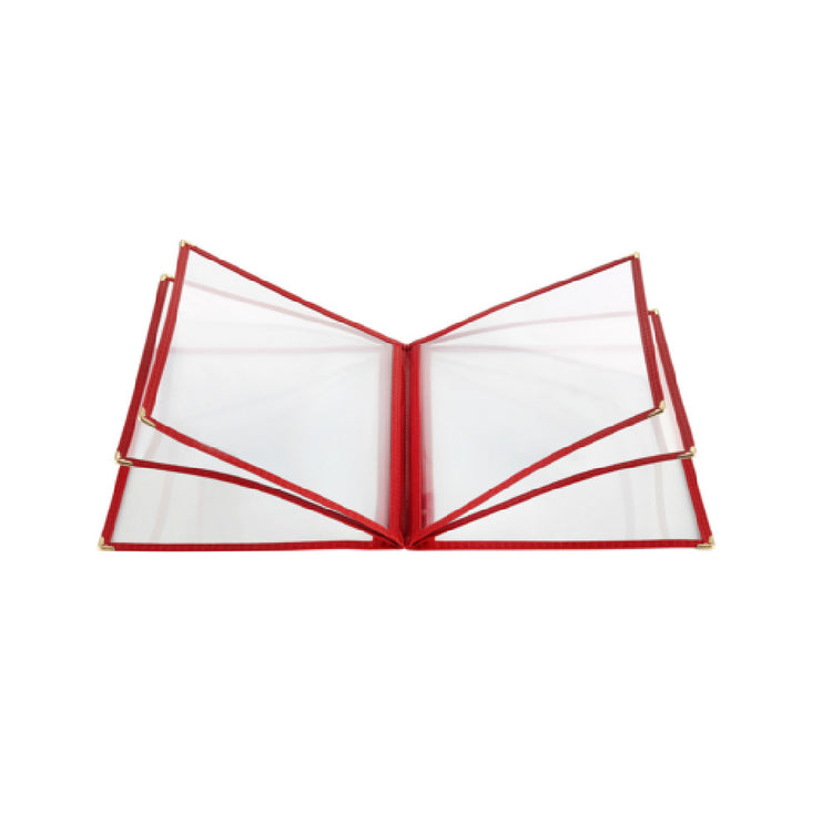 The CAC China MCP6-911RD Menu Cover is a versatile tool designed to cater to the needs of diverse segments in the hospitality industry. It features a 6-pocket design, allowing for the presentation of multiple menu pages, each measuring 8-1/2" x 11", ideal for letter-size inserts. The clear double-sided view ensures that menus are easily legible for customers, enhancing the dining experience by providing a comprehensive view of all available options. This menu cover is accentuated with brass corners, adding a touch of elegance and durability, while the red trim provides an eye-catching detail that complements a variety of restaurant décors. Packed by 50 each per case, this product is suitable for larger establishments requiring bulk supplies. The high-quality construction of the CAC China MCP6-911RD Menu Cover makes it an excellent choice for restaurants, cafes, and hotels looking to present their menus in a professional and aesthetically pleasing manner. Its thoughtful design and robust features highlight its utility and appeal within the food service industry, ensuring that it meets both aesthetic and practical needs efficiently.