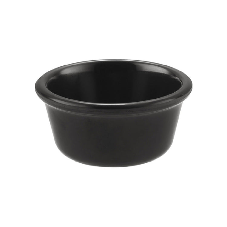 The CAC China MRKF-6-BLK Ramekin 6 Oz. 3-7/8" Dia. Round is a versatile and durable serving solution ideal for both commercial and residential use. This ramekin is crafted from high-quality melamine, which provides excellent break, stain, and odor resistance, ensuring longevity and maintaining an attractive appearance over time. With a capacity of 6 ounces and a round shape measuring 3-7/8 inches in diameter, this black ramekin is perfect for serving sauces, dips, and individual portions of desserts or side dishes. Its smooth surface allows for easy cleaning and is dishwasher safe, enhancing convenience in fast-paced kitchen environments. Packed by 8 dozen per case, it caters to high-volume establishments, making it a practical choice for restaurants, caterers, and event planners who require reliable and stylish tableware. The black color adds a modern and sophisticated touch to any table setting, appealing to a wide range of dining experiences. The CAC China MRKF-6-BLK Ramekin's unique value proposition lies in its combination of durability, aesthetic appeal, and functional design, making it an essential component for food service operations seeking to present their culinary creations with style and efficiency.