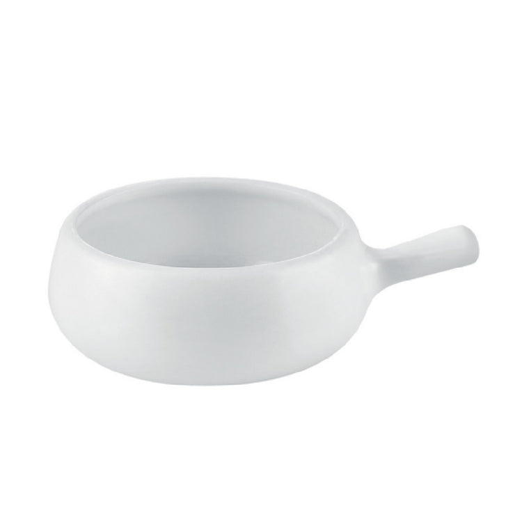 The CAC China OC-15-P Onion Soup Crock is a versatile and durable piece, perfect for various food service establishments. This crock boasts a generous capacity of 16 oz., making it ideal for serving hearty portions of soups, stews, and other hot dishes. Its dimensions are 7-1/8"L x 5-3/8"W x 2-1/4"H, providing ample space while maintaining a manageable size for service and storage. Crafted from high-quality porcelain, this soup crock features a Super White finish that adds a touch of elegance to any table setting. The inclusion of a handle ensures safe and easy transport from kitchen to table. Designed for modern convenience, the CAC China OC-15-P is dishwasher, oven, and microwave safe, offering users flexibility and ease of use in various culinary applications. Sold by the case and packed two dozen per case, this product is a practical choice for restaurants, cafeterias, and catering services seeking reliable and attractive serving solutions. Its robust construction and classic design make it a valuable addition to professional kitchens, ensuring that it meets the demands of high-volume service while maintaining aesthetic appeal.