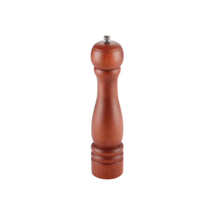 The CAC China PMW1-10BN Pepper Mill 10"H Ergonomic Metal Grinding Mechanism is a uniquely designed kitchen essential tailored for both home cooks and professional chefs. Standing at 10 inches in height, this pepper mill features a sophisticated ergonomic metal grinding mechanism that ensures a smooth, efficient grinding process. The adjustable top metal grinding knob allows users to customize the coarseness of their pepper, catering to varied culinary preferences and requirements. Crafted from solid hardwood, the mill offers durability and a sturdy feel while maintaining a refined aesthetic with its brown matte finish. Its construction not only emphasizes longevity but also provides an elegant touch to any kitchen decor. The product is packed by 24 each per case, making it an ideal choice for commercial establishments such as restaurants and catering services. This pepper mill combines functionality with style, making it a valuable tool for enhancing the flavor and presentation of dishes across various culinary applications. Its design caters to different market segments, from individual consumers seeking high-quality kitchenware to businesses requiring reliable and efficient cooking tools for large-scale food preparation. The CAC China PMW1-10BN Pepper Mill exemplifies the fusion of practicality and aesthetics in kitchen equipment.