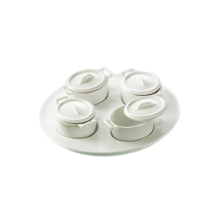 The CAC China PT-B5 Gourmet Collection Tray and Jar Set is a premium offering designed for those who value aesthetics and functionality in tableware. This set includes four oval jars, each with a capacity of 3 ounces and dimensions of 4 inches in length, 3 inches in width, and 2-1/4 inches in height. Accompanied by matching lids, these jars are ideal for serving a variety of gourmet condiments or small dishes. The accompanying round tray, measuring 9-1/2 inches in diameter and 1/2 inch in height, provides a stable and elegant display platform. Crafted from Super White porcelain, this set is not only visually appealing but also highly durable, boasting the ability to withstand the rigors of a commercial kitchen environment. The materials used ensure that the set is dishwasher, oven, and microwave safe, offering versatility for different culinary settings. Sold by the case with six sets per case, the CAC China PT-B5 is perfect for upscale restaurants, caterers, and hospitality businesses seeking to enhance their service offerings with sophisticated and reliable serving solutions.