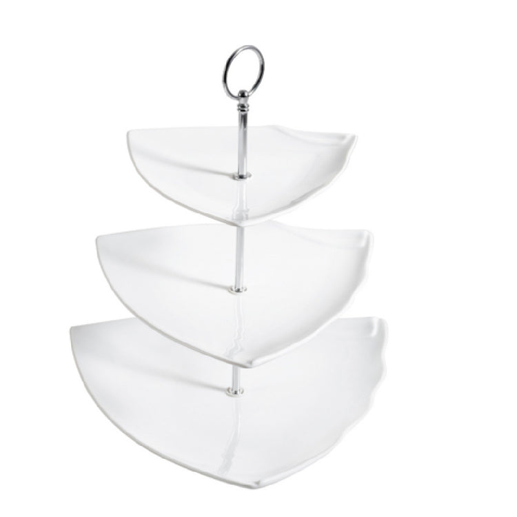 The CAC China PTE-T3 Catering Collection Serving Tray 3-tier is a versatile and elegant addition to any dining or catering setup. This serving tray comprises three distinct tiers: an 11-3/4" wide base tier, a 9" wide middle tier, and a 7-1/2" wide top tier, all culminating to a height of 13-1/2". Its unique triangular design sets it apart, providing both aesthetic appeal and functional serving space. Constructed from high-quality porcelain in a pristine Super White finish, this tray is not only visually appealing but also highly practical, being dishwasher, oven, and microwave safe. This flexibility makes it ideal for various segments within the food service industry, including restaurants, catering companies, and event organizers, who require durable and multifunctional serving solutions. Sold by the case and packed in sets of eight, the CAC China PTE-T3 is designed to meet the needs of large-scale operations, ensuring efficiency and consistency in service presentation. Its robust construction and elegant design make it a worthwhile investment for any professional setting seeking to enhance their service capabilities with a touch of sophistication.