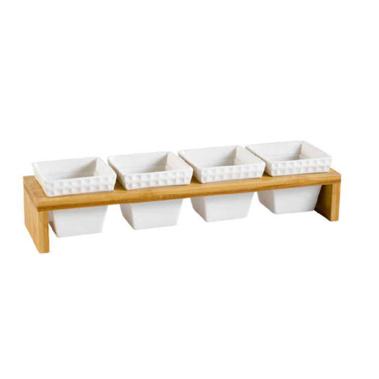 The CAC China PTW-5 Accessories Bowl Set is an elegantly designed five-piece set ideal for both professional and home use, offering versatility with its unique design. The set includes four 7 oz. square porcelain bowls, each measuring 3-1/2 inches in length, 3-1/2 inches in width, and 3 inches in height, perfect for serving a variety of small dishes or condiments. Adding to its allure, the set features a stylish 15-3/4 inch long, 4-1/4 inch wide, and 2-1/2 inch high rectangular bamboo stand, providing a sophisticated presentation platform. The bowls are crafted from bone white porcelain, ensuring a clean and timeless look that complements any table setting. This set is dishwasher, oven, and microwave safe, emphasizing its practicality and adaptability for any culinary environment. Sold by the case with 12 sets per case, the CAC China PTW-5 is ideal for catering services, restaurants, and hospitality sectors that require durable and aesthetically pleasing serveware. Its robust build quality and ease of maintenance make it an appealing choice for service industry professionals seeking reliable and stylish service solutions.