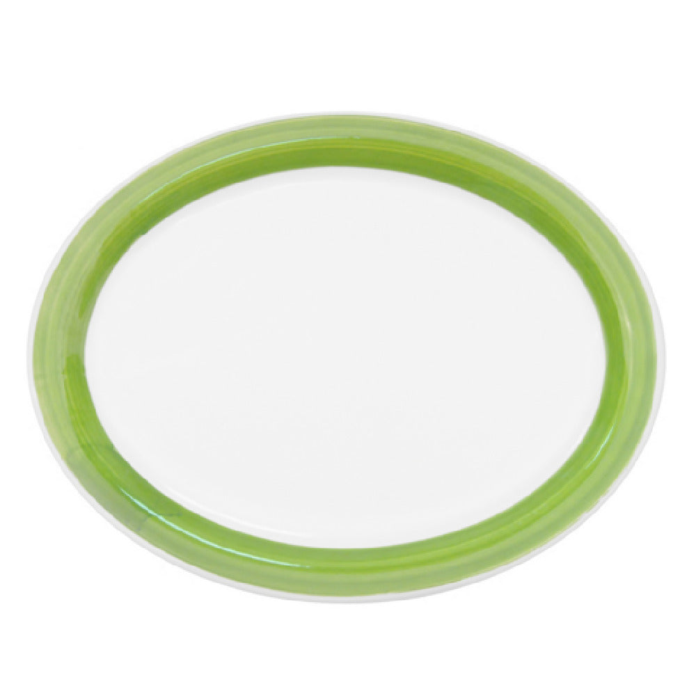 The CAC China R-14NR-G Rainbow Platter is a meticulously crafted piece of stoneware, measuring 13-1/2 inches in length, 10-1/8 inches in width, and 1-1/2 inches in height. This oval platter is distinguished by its narrow rim, which adds a touch of elegance to its design while maximizing its surface area for serving. Offered in a vibrant green hue, it stands out in various settings, from casual dining to more formal occasions. The platter is dishwasher, oven, and microwave safe, making it versatile and practical for different culinary applications. Whether it's used for serving appetizers in a bustling restaurant or for showcasing a main dish at a family gathering, this platter delivers both in functionality and aesthetic appeal. Sold by the case, each package includes a dozen platters, catering to establishments that require bulk quantities without compromising on quality. The robust nature of the stoneware material ensures durability and resistance to chipping, making it a reliable choice for high-volume environments such as hotels, caterers, and banquet halls. The CAC China R-14NR-G Rainbow Platter is an excellent addition to any food service operation, combining practicality with a splash of color and style.