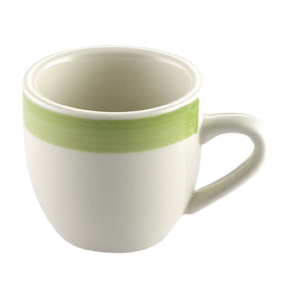 The CAC China R-35-G Rainbow A.D Cup is a versatile and durable piece of stoneware, measuring 2-1/2 inches in diameter and 2-1/2 inches in height. With a capacity of 3-1/2 ounces, this cup is perfect for a variety of serving needs, whether in a café, restaurant, or home setting. Its eye-catching green and American White color combination adds a touch of elegance and charm to any table setting. Constructed from high-quality ceramic, the Rainbow A.D Cup is designed to be safe for use in dishwashers, ovens, and microwaves, providing practical convenience and flexibility in both preparation and cleanup. Sold by the case, with each case containing three dozen cups, this product is ideal for larger establishments or events where serving consistency and style are important. The cup's round shape and robust construction ensure it will withstand regular use while maintaining its aesthetic appeal, making it an excellent choice for professional settings seeking both functionality and a distinctive look. The CAC China R-35-G Rainbow A.D Cup seamlessly blends practicality with a stylish design, making it a valuable addition to any kitchen or dining environment.