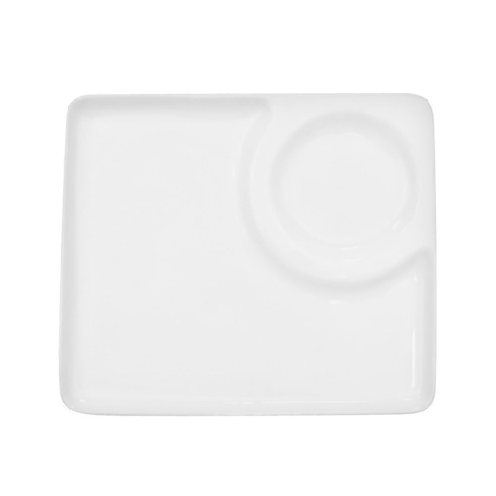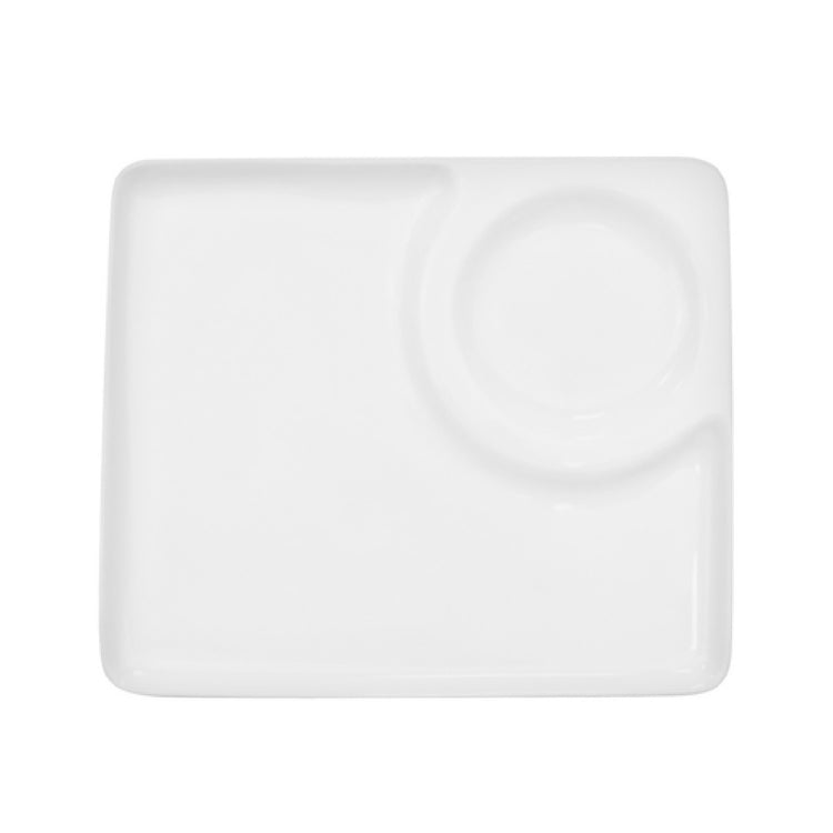 The CAC China RCN-P9 RCN Specialty Plate is a meticulously crafted piece of porcelain dinnerware, measuring 9 inches in length, 9 inches in width, and 1/2 inch in height, with a distinct square shape. This specialty plate stands out with its integrated sauce compartment, offering a practical solution for enhancing presentation and serving versatility. Designed to withstand the rigors of professional kitchens, it is dishwasher, oven, and microwave safe, making it suitable for a range of culinary applications. The plate's Super White finish not only elevates the aesthetic appeal but also complements any table setting, from casual to fine dining. Sold by the case, with each case packed with 2 dozen plates, it is an ideal choice for restaurants, catering businesses, and hospitality venues seeking both style and function. The durability of porcelain ensures longevity, while its elegant design meets the demands of different market segments, from high-end to everyday dining settings. The CAC China RCN-P9 RCN Specialty Plate embodies a synthesis of form and function, making it a valuable addition to any dining collection.