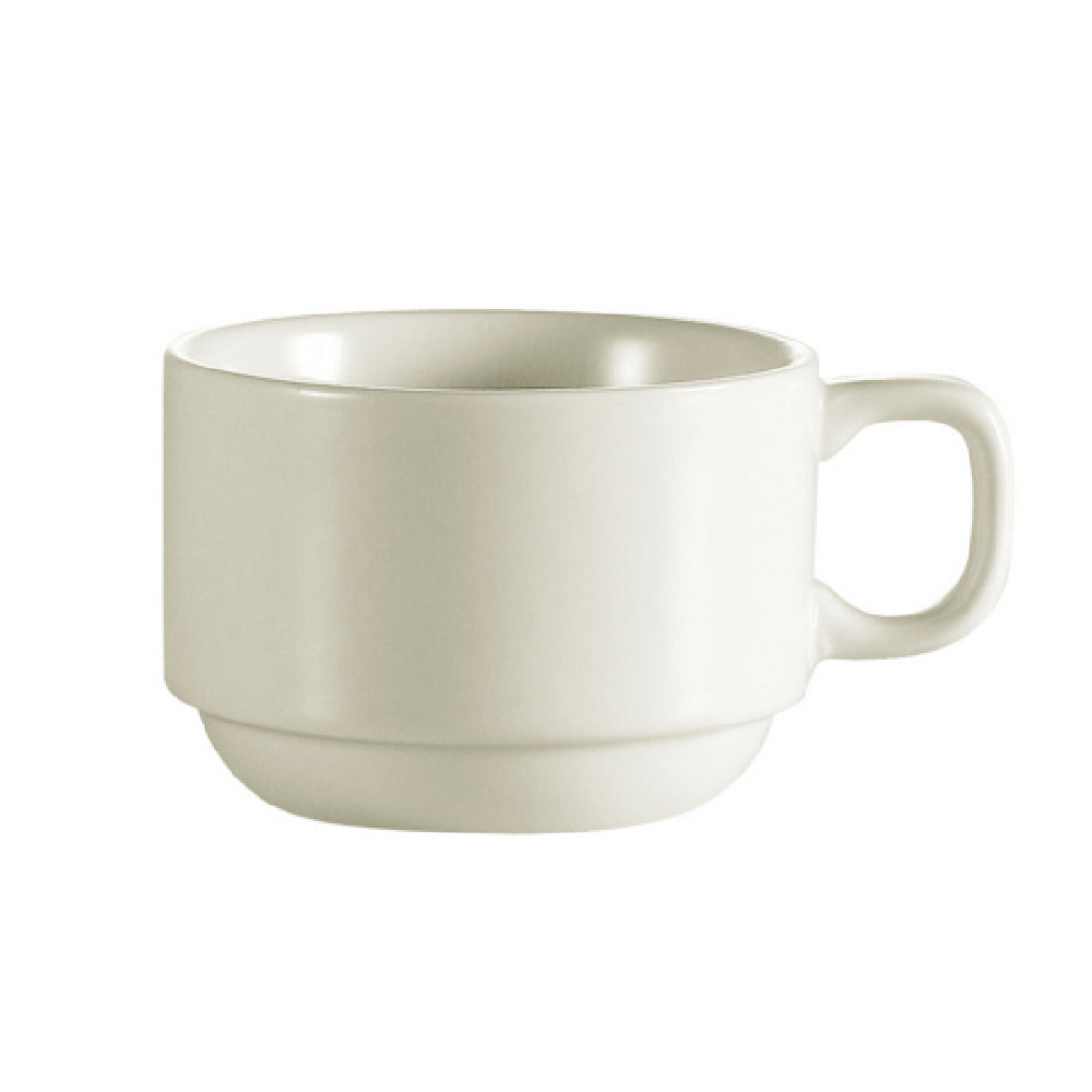 The CAC China REC-23 REC Coffee Cup is a meticulously crafted piece of stoneware designed for diverse hospitality and catering environments. With a capacity of 7 ounces, this coffee cup features a round shape with dimensions of 3-1/4 inches in diameter and 2-1/2 inches in height, making it ideal for serving a perfect portion of coffee. Its stackable design facilitates efficient storage, freeing up valuable space in busy kitchen settings. The cup is engineered for durability and versatility, being dishwasher, oven, and microwave safe, which streamlines operations and ensures easy handling in high-demand scenarios. Crafted from high-quality ceramic stoneware, it maintains heat effectively, ensuring a warm beverage for longer periods. The American White color adds a classic, timeless aesthetic that complements various table settings, from casual dining to more upscale presentations. Sold in a case of three dozen, it accommodates large-scale usage and provides exceptional value for establishments ranging from cafes to large banquet facilities. This coffee cup's robust construction and practical design make it a reliable choice for foodservice professionals seeking dependable, high-performance dinnerware solutions.