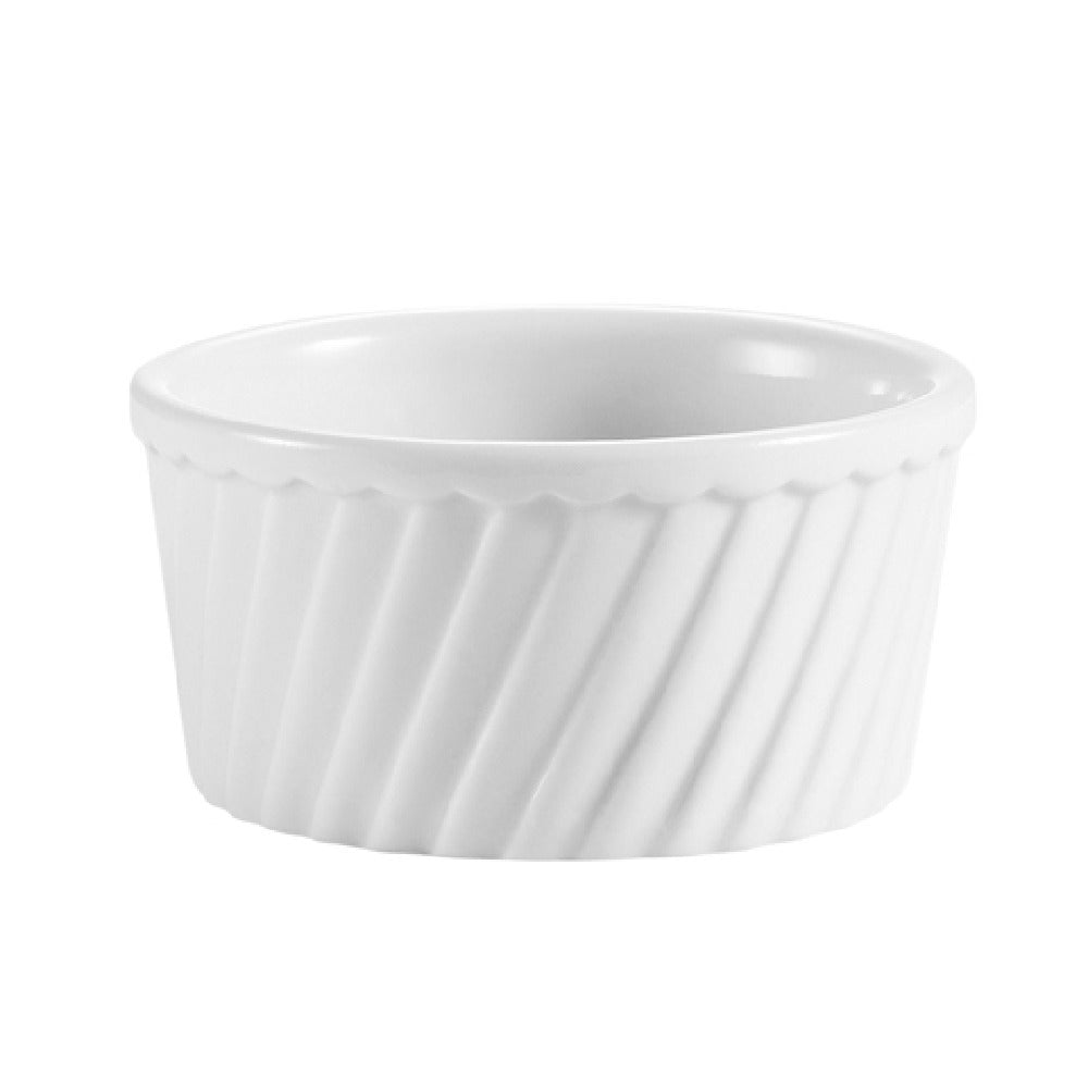 The CAC China RKF-18-S RKF Souffle Bowl is a meticulously crafted stoneware piece designed for both functionality and elegance. With a capacity of 18 ounces, this bowl is perfect for serving a variety of dishes, from individual soufflés to sides and desserts. The bowl measures 5 inches in diameter and stands at 2-1/4 inches high, offering ample space while maintaining a compact form. Its round, fluted design not only adds a touch of sophistication but also enhances grip and handling. Made from durable ceramic, the bowl is engineered to withstand the rigors of a busy kitchen, being dishwasher, oven, and microwave safe. The Bone White finish provides a neutral and appealing aesthetic that complements any table setting or dining decor. Sold by the case and packed with 2 dozen per case, this product is ideal for restaurants, catering businesses, and hospitality services seeking reliable and stylish serveware. The CAC China RKF-18-S RKF Souffle Bowl combines practicality with a classic design, making it a versatile addition to any culinary collection, suitable for diverse applications within the food service industry.