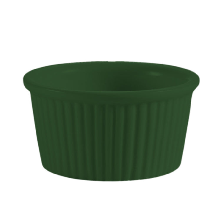The CAC China RKF-4-G RKF Ramekin 4 Oz. 3-1/8" Dia. X 1-1/2"H is a versatile and durable piece of kitchenware designed for various culinary settings. This round, fluted ramekin is crafted from high-quality stoneware ceramic, ensuring it is both robust and stylish. With a capacity of 4 ounces, it is perfectly sized for individual portions, making it suitable for serving side dishes, desserts, or condiments in both casual and formal dining environments. The dimensions of 3-1/8 inches in diameter and 1-1/2 inches in height provide a compact yet functional design, ideal for maximizing table space while offering portion control. In terms of functionality, this ramekin is dishwasher, oven, and microwave safe, which enhances its convenience and flexibility in food preparation and presentation. The appealing green color adds a touch of elegance and can complement various table settings. Sold by case, with 4 dozen per case, it is a cost-effective choice for restaurants, catering services, or home use. The CAC China RKF-4-G RKF Ramekin balances practicality with aesthetic appeal, making it a valuable addition to any kitchen or dining establishment seeking dependable and stylish serveware options.