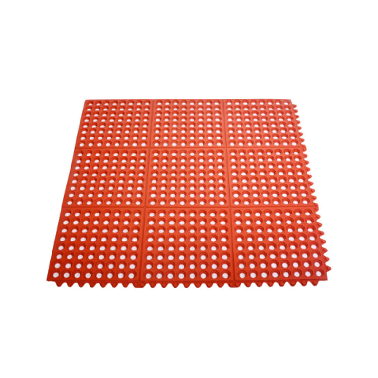 The CAC China RMAT-33RD Floor Mat 3' x 3' 1/2" Thick is an expertly crafted interlocking mat designed for diverse industrial and commercial settings. This mat, measuring 3 feet by 3 feet and with a thickness of 1/2 inch, provides a robust anti-fatigue solution, reducing strain for individuals who stand for extended periods. Constructed from durable rubber, it exhibits impressive slip-resistant properties, enhancing safety in areas prone to wet conditions. Its grease-resistant feature makes it particularly suitable for kitchens and other environments where oils and fats are prevalent, ensuring longevity and ease of maintenance. The vibrant red color provides a visual cue, enhancing visibility and aesthetic appeal in various settings. Designed with interlocking capabilities, the mat can be easily connected with additional mats to cover larger areas, offering flexibility and adaptability to changing floor space requirements. Whether in a bustling restaurant kitchen, an industrial workshop, or a retail environment, the CAC China RMAT-33RD Floor Mat stands out as a reliable choice for businesses seeking to improve safety and comfort for their workforce. Packed as a single unit, it provides a straightforward and efficient flooring solution, reflecting CAC China's commitment to quality and functional design.