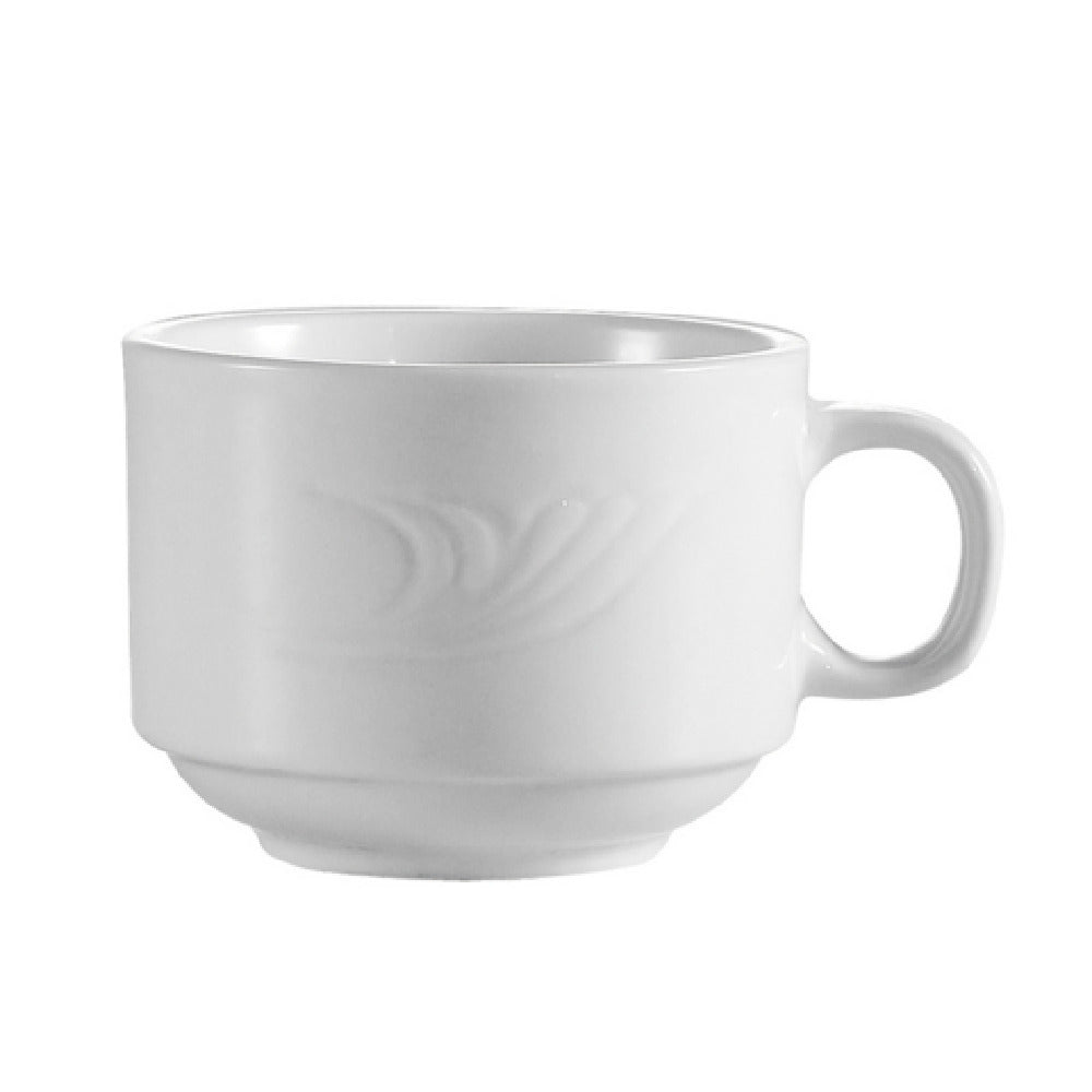 The CAC China RSV-1-S Roosevelt Coffee Cup 8 Oz. is meticulously crafted for functionality and elegance, providing an excellent solution for both commercial and personal settings. With its precise dimensions of 3-1/2 inches in diameter and 2-1/2 inches in height, this round coffee cup offers an optimal capacity of 8 ounces, catering to a variety of serving needs. The stacking design enhances spatial efficiency, making it an ideal choice for environments where storage space is at a premium. This cup features an embossed texture, adding a touch of sophistication to its Super White porcelain construction. Not only is it visually appealing, but it is also highly practical, being both dishwasher and microwave safe, which ensures ease of use and maintenance. Additionally, its oven-safe attribute expands its versatility, allowing for a wide range of serving possibilities. Sold by the case and packed by 3 dozen per case, the CAC China RSV-1-S is designed to meet the demands of high-volume establishments such as cafes, hotels, and restaurants, offering both durability and style. This coffee cup is a valuable addition to any setting that prioritizes both aesthetic and utility in its tableware.