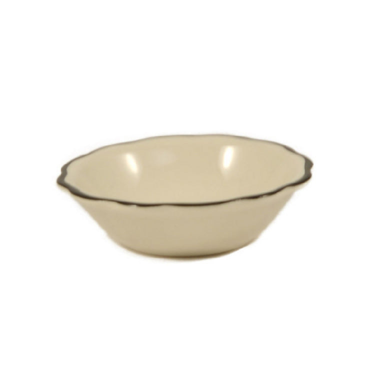 The CAC China SC-11B Seville Fruit Dish 5 Oz. 4-3/4" Dia. X 1-3/8"H is a meticulously crafted stoneware dish that exemplifies both functionality and style. With a capacity of 5 ounces, this round dish is perfectly designed for serving fruit and other small portions. Its dimensions of 4-3/4 inches in diameter and 1-3/8 inches in height make it a compact choice for table settings, yet spacious enough for a generous serving size. The dish features a distinctive scallop edge that adds an elegant touch to its design, making it suitable for a variety of dining environments from casual to upscale. Made from durable stoneware (ceramic), it ensures long-lasting use and resilience in high-traffic settings. Additionally, the dish is dishwasher, oven, and microwave safe, offering convenience and versatility for both commercial and home kitchens. The Black Band/American White color scheme provides a classic and clean appearance that can seamlessly integrate with a wide range of tableware collections. Sold by the case, with 3 dozen dishes per case, the CAC China SC-11B Seville Fruit Dish is an ideal choice for restaurants, catering services, and hospitality venues aiming for style and practicality in serving solutions.