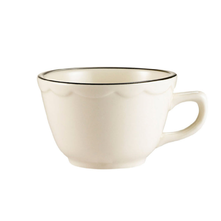 The CAC China SC-1B Seville Coffee Cup is a versatile 7 oz. stoneware cup, designed for a variety of beverage service scenarios. With its dimensions of 3-3/4" diameter and 2-3/8" height, this round coffee cup features a distinct scallop edge, adding a touch of elegance to its aesthetic. The combination of Black Band and American White color scheme offers a classic look suitable for both casual dining and upscale settings. This coffee cup is crafted from durable ceramic material, ensuring longevity and resistance to common wear and tear. Its construction not only enhances durability but also provides the convenience of being dishwasher, oven, and microwave safe, making it ideal for busy cafes, restaurants, or home use. The product is sold by case, with each case packed with 3 dozen cups, ensuring you have ample supply for any dining establishment. The CAC China SC-1B Seville Coffee Cup blends practicality with style, making it a valuable addition to any beverage service that values both aesthetics and functionality.