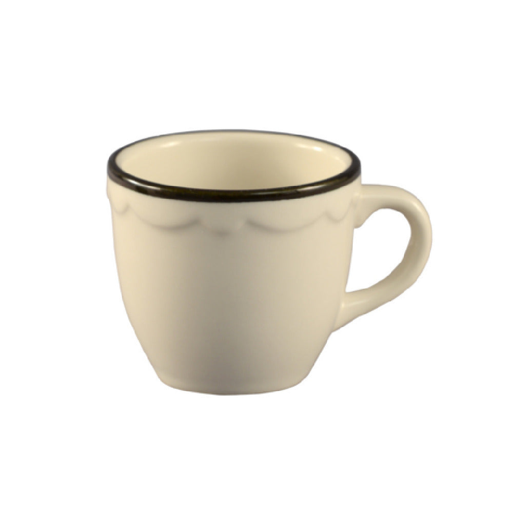 The CAC China SC-35B Seville Demitasse Cup is a distinguished piece of stoneware ideal for various dining settings, from upscale cafes to professional catering events. With a capacity of 3-1/2 oz., this cup is perfectly sized for serving espresso or other specialty coffee beverages. Measuring 2-1/2 inches in diameter and standing 2-1/4 inches tall, its compact form is both elegant and practical. The cup features a distinctive scallop edge, adding a touch of sophistication to its design. It is crafted from high-quality ceramic stoneware, ensuring durability and a sleek finish. The Black Band/American White color scheme offers a classic aesthetic that complements a wide range of table settings. Importantly, the SC-35B is dishwasher, oven, and microwave safe, making it a versatile addition to any kitchen, whether in a bustling restaurant or a home setting. This demitasse cup is sold by the case, with each case containing three dozen cups, making it a practical choice for businesses seeking to maintain ample stock. The CAC China SC-35B Seville Demitasse Cup combines aesthetic appeal with functional design, catering to diverse market segments that value quality and style in their serving ware.