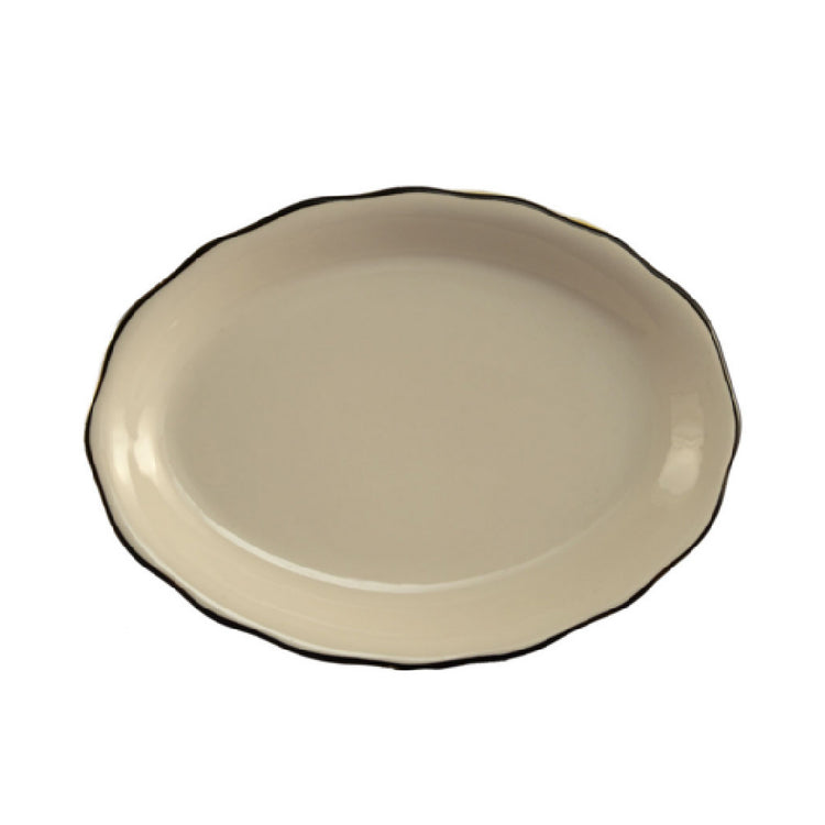 The CAC China SC-40B Seville Platter is a distinctively designed serving piece, measuring 7-1/2 inches in length, 5-3/4 inches in width, and 7/8 inch in height, making it ideal for a variety of culinary presentations. This oval platter is crafted from durable stoneware, specifically ceramic, ensuring its suitability for rigorous foodservice applications. Its scalloped edge adds an elegant touch, while the Black Band/American White color scheme complements diverse table settings. This platter is engineered to withstand the demands of both commercial and domestic environments, being dishwasher, oven, and microwave safe, thus offering practicality and versatility in food preparation and service. Sold by the case and packed in quantities of three dozen per case, the CAC China SC-40B Seville Platter caters effectively to the needs of restaurants, catering companies, and hospitality businesses seeking reliable and aesthetically pleasing dinnerware. This platter seamlessly combines functionality with style, making it a valuable addition to any establishment that prioritizes both durability and visual appeal in its tableware selection.