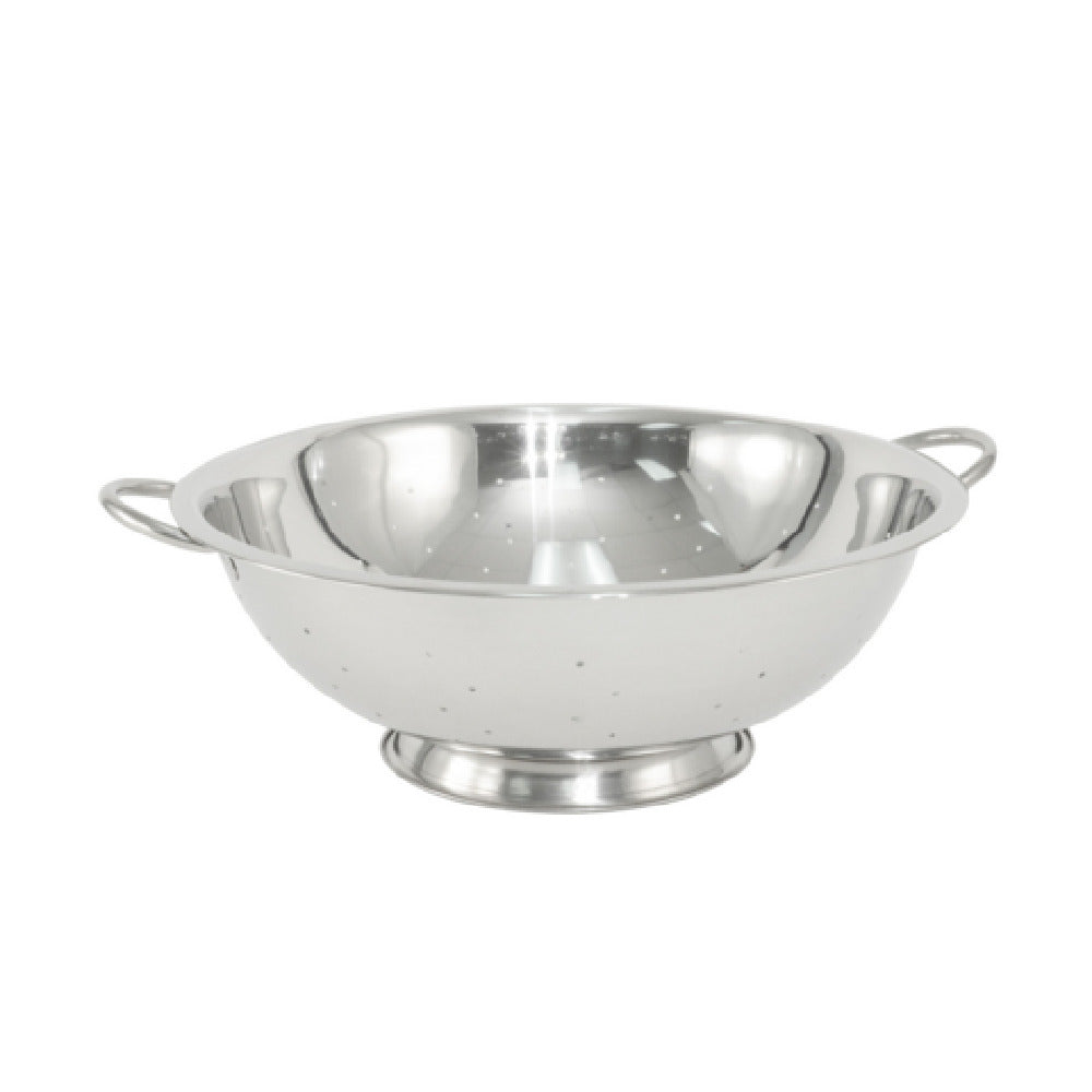 The CAC China SMCD-13 Colander, with its substantial 13-quart capacity, is designed to meet the demands of both commercial and residential kitchens. This colander boasts a sizeable diameter of 16-1/4 inches and a height of 4-3/4 inches, providing ample space for draining large quantities of pasta, vegetables, or other ingredients efficiently. Constructed from durable stainless steel, it ensures longevity and resistance to corrosion, making it a reliable choice for long-term use. The colander is footed, which elevates it for improved drainage and stability during use, while the integrated handles allow for easy maneuverability and control. The SMCD-13 is packed with practicality, offered in cases of 12, catering to larger operations such as catering services, restaurants, and hotels that require reliable and robust kitchen equipment. Its design and capacity make it a versatile tool, suitable for various culinary applications, enhancing efficiency in any kitchen environment. This colander's high-quality construction and thoughtful design details make it an indispensable asset for professional chefs and home cooks alike, who appreciate its combination of form, function, and durability.